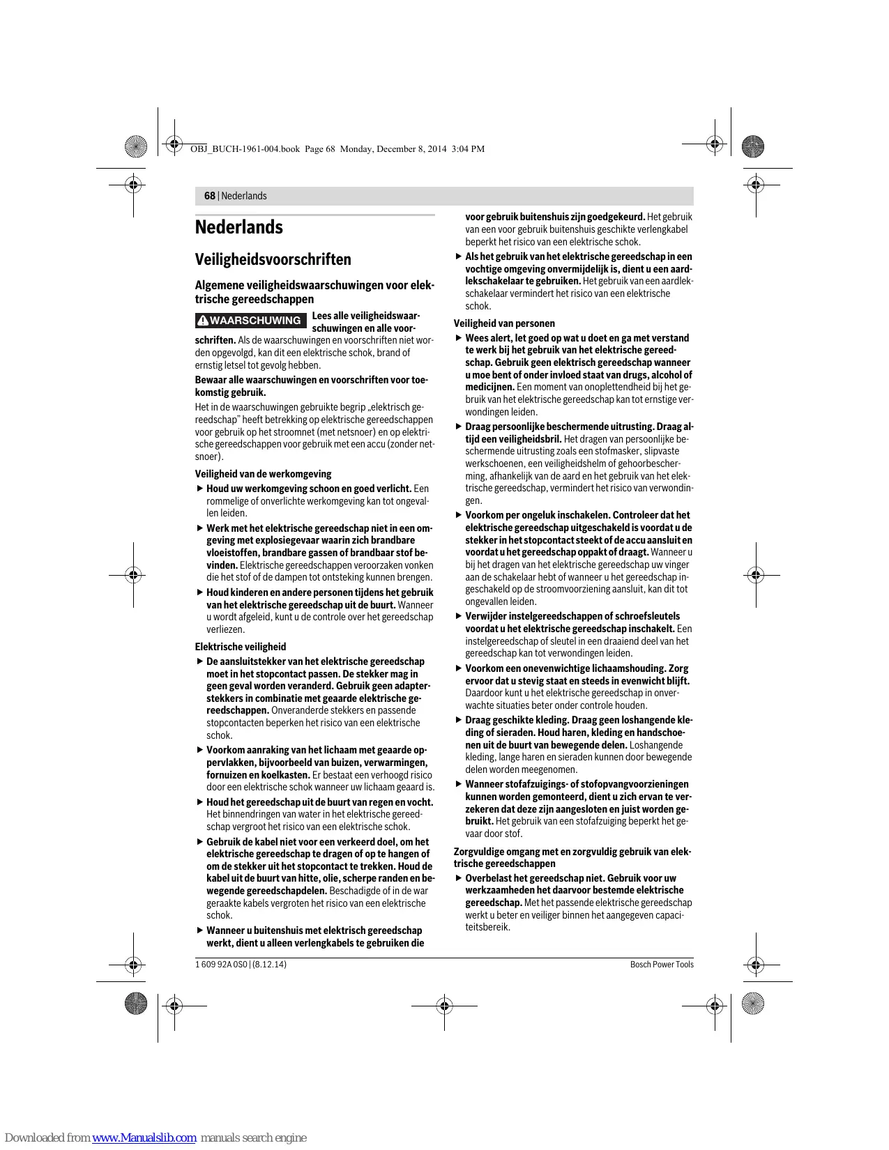 Troncatura di metallo Durante la troncatura con abrasivo combinato utilizzare sempre la cuffia di protezione per la troncatura 12. Eseguendo lavori di troncatura, avanzare moderatamente ed adattando il movimento al materiale in elaborazione. Non esercitare nessuna pressione sulla mola da taglio, evitare angolature improprie e non oscillare. Non cercare mai di frenare sottoponendo a pressione laterale mole abrasive da taglio che continuano a girare per inerzia. Con l’elettroutensile si deve sempre operare con fresatura bidirezionale. In caso contrario vi è il pericolo che la macchina possa essere spinta in modo non controllato fuori della linea di taglio. In caso di troncatura di profili e tubi a sezione quadra, si consiglia di accostare l’utensile alla sezione più piccola. Troncatura di materiale minerale Durante la troncatura in materiali pietrosi è necessario provvedere ad una sufficiente aspirazione della polvere. Indossare una maschera di protezione contro la polvere. L’elettroutensile può essere utilizzato esclusivamente per il taglio a secco/levigatura a secco. Bosch Power Tools OBJ_BUCH-1961-004.book Page 67 Monday, December 8, 2014 3:04 PM Italiano | 67 Per la troncatura di materiali pietrosi utilizzare preferibilmente una mola da taglio diamantata. Utilizzando la cuffia di aspirazione per la troncatura con slitta di guida 19, l’aspirapolvere per l’aspirazione della polvere minerale deve essere omologato. Bosch offre aspirapolveri adatti. Avviare l’elettroutensile ed applicarlo con la parte anteriore della slitta di guida sul pezzo in lavorazione. Spingere l’elettroutensile avanzando moderatamente ed adattando il movimento al materiale in elaborazione. Troncando materiali particolarmente duri, p. es. calcestruzzo ad alto contenuto di ciottoli, la mola da taglio diamantata può surriscaldarsi e subire danni. Un evidente indizio per una tale situazione è quando una mola abrasiva da taglio diritto di diamante produce una corona di scintille. In questo caso, interrompere l’operazione di taglio e far girare brevemente la mola da taglio diamantata in funzionamento a vuoto ed al massimo della velocità in modo che possa raffreddarsi. Una sensibile diminuzione dell’avanzamento di lavoro e la formazione di corona di scintille sono un chiaro indizio per una mola da taglio diamantata non più sufficientemente affilata. Essa può essere riaffilata eseguendo dei brevi tagli su materiale abrasivo come p. es. su arenaria calcare. Indicazioni relative alla statica Fessure in pareti portanti sono soggette alla norma DIN 1053 parte 1 oppure alle specifiche norme vigenti nel rispettivo Paese. È obbligatorio attenersi a tali leggi e normative. Prima di iniziare a lavorare, consultare l’ingegnere calcolatore responsabile, l’architetto oppure la direzione responsabile dei lavori. Manutenzione ed assistenza Manutenzione e pulizia Prima di qualunque intervento sull’elettroutensile estrarre la spina di rete dalla presa. Per poter garantire buone e sicure operazioni di lavoro, tenere sempre puliti l’elettroutensile e le prese di ventilazione. Conservare e trattare con cura l’accessorio. Qualora si rendesse necessaria una sostituzione del cavo di collegamento, la stessa deve essere effettuata dalla Bosch oppure da un centro di assistenza clienti autorizzato per elettroutensili Bosch per evitare pericoli per la sicurezza. Assistenza clienti e consulenza impieghi Il servizio di assistenza risponde alle Vostre domande relative alla riparazione ed alla manutenzione del Vostro prodotto nonché concernenti le parti di ricambio. Disegni in vista esplosa ed informazioni relative alle parti di ricambio sono consultabili anche sul sito: www.bosch-pt.com Il team Bosch che si occupa della consulenza impieghi vi aiuterà in caso di domande relative ai nostri prodotti ed ai loro accessori. In caso di richieste o di ordinazione di pezzi di ricambio, comunicare sempre il codice prodotto a 10 cifre riportato sulla targhetta di fabbricazione dell’elettroutensile! Italia Officina Elettroutensili Robert Bosch S.p.A. Corso Europa, ang. Via Trieste 20 20020 LAINATE (MI) Tel.: (02) 3696 2663 Fax: (02) 3696 2662 Fax: (02) 3696 8677 E-Mail: officina.elettroutensili@it.bosch.com Svizzera Sul sito www.bosch-pt.com/ch/it è possible ordinare direttamente on-line i ricambi. Tel.: (044) 8471513 Fax: (044) 8471553 E-Mail: Aftersales.Service@de.bosch.com Smaltimento Avviare ad un riciclaggio rispettoso dell’ambiente gli imballaggi, gli elettroutensili e gli accessori dismessi. Non gettare elettroutensili dismessi tra i rifiuti domestici! Solo per i Paesi della CE: Conformemente alla norma della direttiva 2012/19/UE sui rifiuti di apparecchiature elettriche ed elettroniche (RAEE) ed all’attuazione del recepimento nel diritto nazionale, gli elettroutensili diventati inservibili devono essere raccolti separatamente ed essere inviati ad una riutilizzazione ecologica. Con ogni riserva di modifiche tecniche. In caso di condizioni di impiego estreme utilizzare sempre un impianto di aspirazione. Soffiare spesso sulle feritoie di ventilazione e preinstallare un interruttore di sicurezza per correnti di guasto (PRCD). In caso di lavorazione di metalli è possibile che si depositi polvere conduttrice all’interno dell’elettroutensile. L’isolamento di protezione dell’elettroutensile può esserne pregiudicato. Bosch Power Tools Downloaded from www.Manualslib.com manuals search engine 1 609 92A 0S0 | (8.12.14) OBJ_BUCH-1961-004.book Page 68 Monday, December 8, 2014 3:04 PM 68 | Nederlands Nederlands Veiligheidsvoorschriften Algemene veiligheidswaarschuwingen voor elektrische gereedschappen Lees alle veiligheidswaarschuwingen en alle voorschriften. Als de waarschuwingen en voorschriften niet worden opgevolgd, kan dit een elektrische schok, brand of ernstig letsel tot gevolg hebben. Bewaar alle waarschuwingen en voorschriften voor toekomstig gebruik. Het in de waarschuwingen gebruikte begrip „elektrisch g