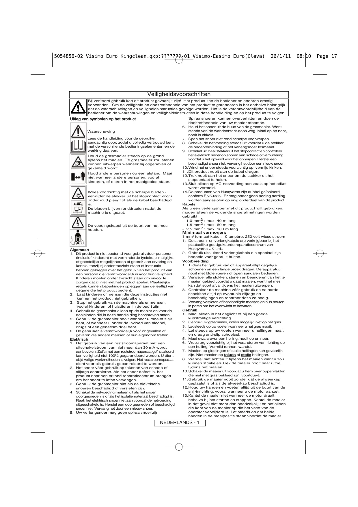 kunnen struikelen.Trek de maaier nooit naar u toe tijdens het maaien. 10.Schakel de maaier uit voordat u hem over oppervlakten, die niet met gras bekleed zijn, voortduwt. 11.Gebruik de maaier nooit zonder dat de afweerkap geplaatst is of als de afweerkap beschadigd is. 12.Houd uw handen en voeten altijd uit de buurt van de snij-inrichting, vooral wanneer u de motor aanzet. 13.Kantel de maaier niet wanneer de motor draait, behalve bij het starten en stoppen. Kantel de maaier in dat geval niet meer dan noodzakelijk en hef alleen die kant van de maaier op die het verst van de operator verwijderd is. Let steeds op dat beide handen in de maaipositie staan voordat de maaier NEDERLANDS - 1 08:10 Page 17 5054856-02 Visimo Euro Kingclean.qxp:???????-01 Visimo-Easimo Euro(Cleva) 26/1/11 Veiligheidsvoorschriften terug op de grond gezet wordt. 14 Uw handen uit de buurt van de uitwerptrechter houden. 15.Hef of draag de maaier nooit terwijl de motor draait of de machine nog aan de netvoeding verbonden is. 16.Haal de stekker uit het stopcontact: - als u de machine voor een tijdje alleenlaat; - voordat u een verstopping vrijmaakt; - voordat u de maaier inspecteert of schoonmaakt of aan de machine gaat werken; - nadat de maaier in contact kwam met een vreemd object - Gebruik de maaier niet tenzij u er zeker van bent dat de maaier veilig kan werken; - als de maaier abnormaal begint te trillen. Controleer onmiddellijk. Te grote trillingen kan letsel veroorzaken. Onderhouden en opbergen