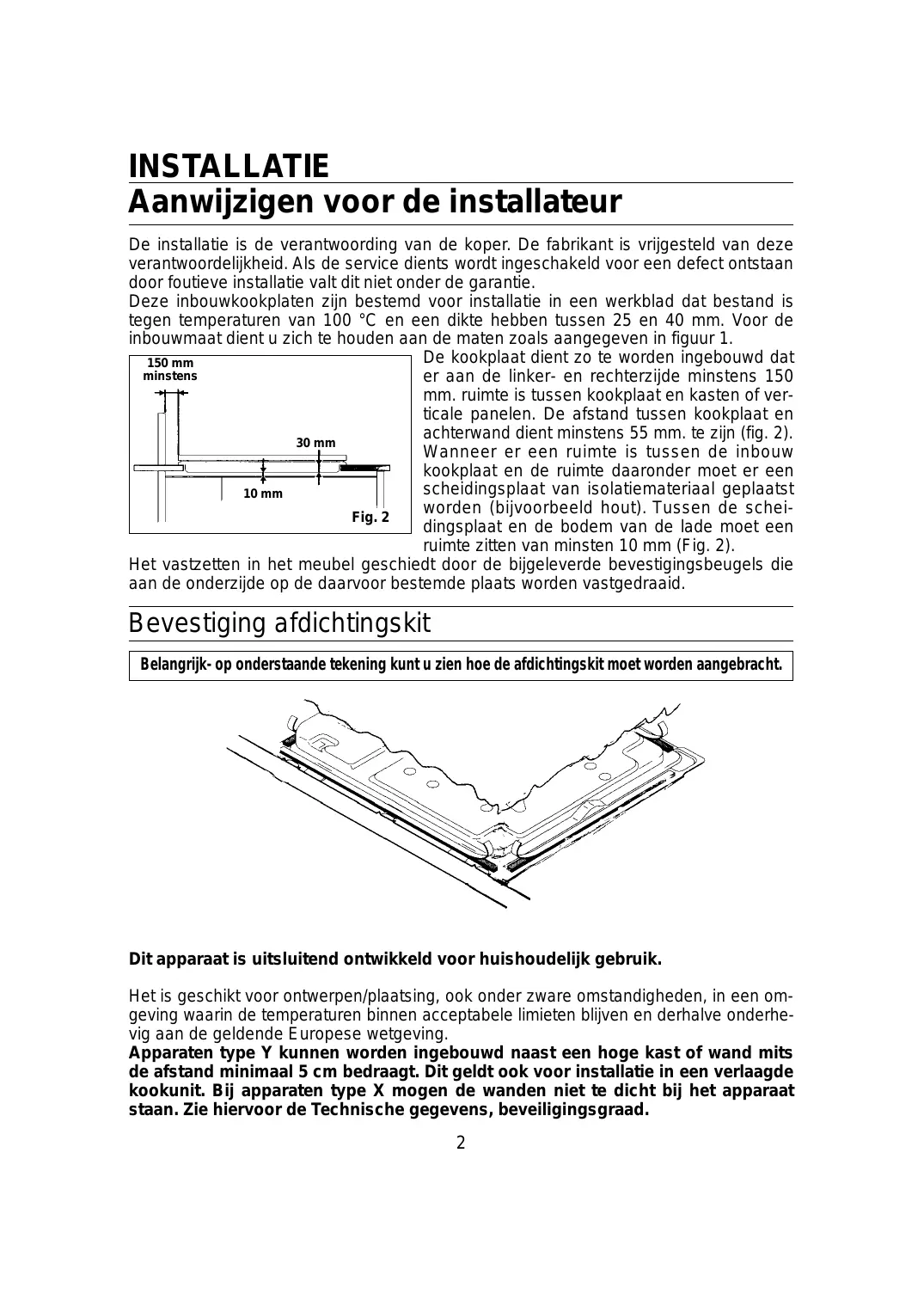 INSTALLATIE Aanwijzigen voor de installateur De installatie is de verantwoording van de koper. De fabrikant is vrijgesteld van deze verantwoordelijkheid. Als de service dients wordt ingeschakeld voor een defect ontstaan door foutieve installatie valt dit niet onder de garantie. Deze inbouwkookplaten zijn bestemd voor installatie in een werkblad dat bestand is tegen temperaturen van 100 °C en een dikte hebben tussen 25 en 40 mm. Voor de inbouwmaat dient u zich te houden aan de maten zoals aangegeven in figuur 1. De kookplaat dient zo te worden ingebouwd dat 150 mm minstens er aan de linker- en rechterzijde minstens 150 mm. ruimte is tussen kookplaat en kasten of verticale panelen. De afstand tussen kookplaat en achterwand dient minstens 55 mm. te zijn (fig. 2). 30 mm Wanneer er een ruimte is tussen de inbouw kookplaat en de ruimte daaronder moet er een scheidingsplaat van isolatiemateriaal geplaatst 10 mm worden (bijvoorbeeld hout). Tussen de scheiFig. 2 dingsplaat en de bodem van de lade moet een ruimte zitten van minsten 10 mm (Fig. 2). Het vastzetten in het meubel geschiedt door de bijgeleverde bevestigingsbeugels die aan de onderzijde op de daarvoor bestemde plaats worden vastgedraaid. Bevestiging afdichtingskit Belangrijk- op onderstaande tekening kunt u zien hoe de afdichtingskit moet worden aangebracht. Dit apparaat is uitsluitend ontwikkeld voor huishoudelijk gebruik. Het is geschikt voor ontwerpen/plaatsing, ook onder zware omstandigheden, in een omgeving waarin de temperaturen binnen acceptabele limieten blijven en derhalve onderhevig aan de geldende Europese wetgeving. Apparaten type Y kunnen worden ingebouwd naast een hoge kast of wand mits de afstand minimaal 5 cm bedraagt. Dit geldt ook voor installatie in een verlaagde kookunit. Bij apparaten type X mogen de wanden niet te dicht bij het apparaat staan. Zie hiervoor de Technische gegevens, beveiligingsgraad.