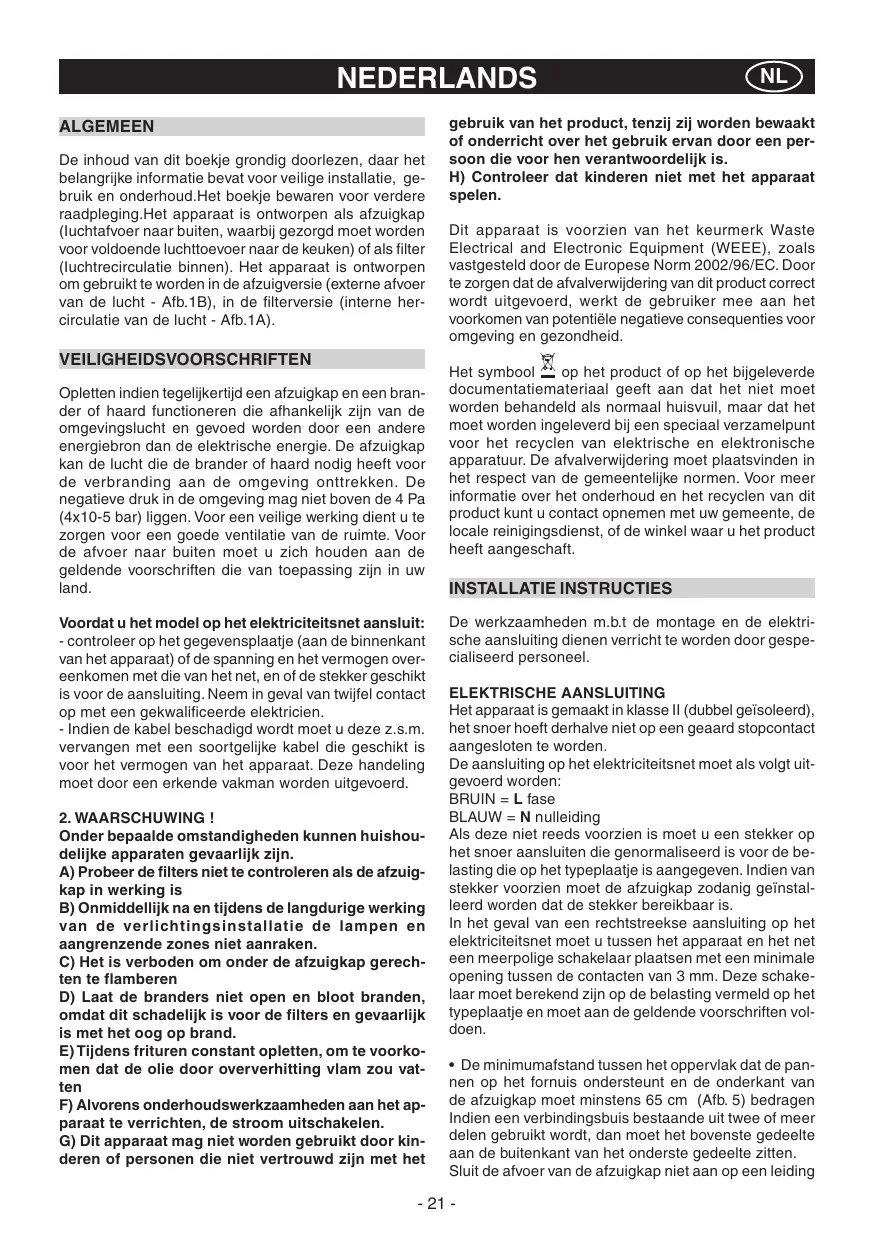 NEDERLANDS ALGEMEEN De inhoud van dit boekje grondig doorlezen, daar het belangrijke informatie bevat voor veilige installatie, gebruik en onderhoud.Het boekje bewaren voor verdere raadpleging.Het apparaat is ontworpen als afzuigkap (Iuchtafvoer naar buiten, waarbij gezorgd moet worden voor voldoende luchttoevoer naar de keuken) of als filter (Iuchtrecirculatie binnen). Het apparaat is ontworpen om gebruikt te worden in de afzuigversie (externe afvoer van de lucht - Afb.1B), in de filterversie (interne hercirculatie van de lucht - Afb.1A). VEILIGHEIDSVOORSCHRIFTEN Opletten indien tegelijkertijd een afzuigkap en een brander of haard functioneren die afhankelijk zijn van de omgevingslucht en gevoed worden door een andere energiebron dan de elektrische energie. De afzuigkap kan de lucht die de brander of haard nodig heeft voor de verbranding aan de omgeving onttrekken. De negatieve druk in de omgeving mag niet boven de 4 Pa (4x10-5 bar) liggen. Voor een veilige werking dient u te zorgen voor een goede ventilatie van de ruimte. Voor de afvoer naar buiten moet u zich houden aan de geldende voorschriften die van toepassing zijn in uw land. Voordat u het model op het elektriciteitsnet aansluit: - controleer op het gegevensplaatje (aan de binnenkant van het apparaat) of de spanning en het vermogen overeenkomen met die van het net, en of de stekker geschikt is voor de aansluiting. Neem in geval van twijfel contact op met een gekwalificeerde elektricien. - Indien de kabel beschadigd wordt moet u deze z.s.m. vervangen met een soortgelijke kabel die geschikt is voor het vermogen van het apparaat. Deze handeling moet door een erkende vakman worden uitgevoerd.