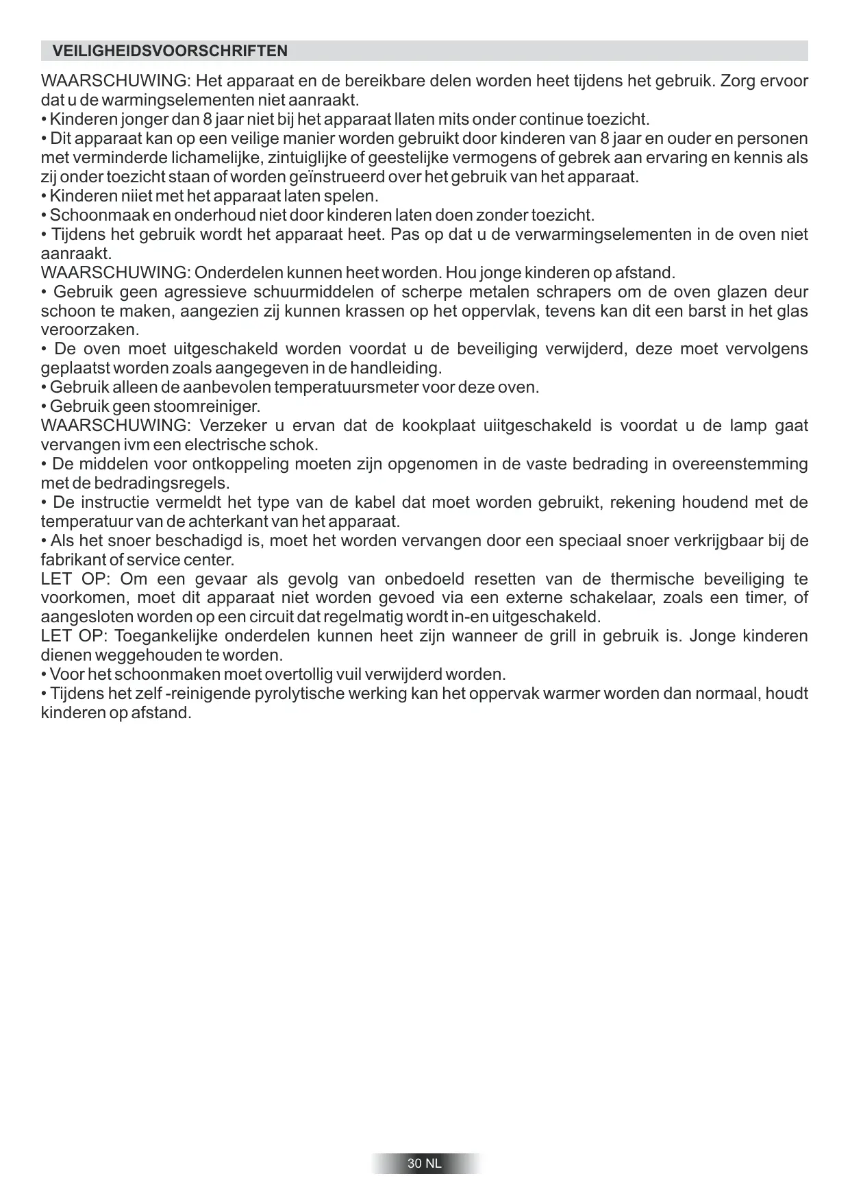 - Tijdens het zelf -reinigende pyrolytische werking kan het oppervak warmer worden dan normaal, houdt kinderen op afstand. 30 NL ALGEMENE AANWIJZINGEN Lees deze handleiding aandachtig. Hierin treff u betangrijke gegevens aan omtrent installatie, gebruik en onderhoud. Bewaar deze handleiding voor eventuele toekomstige raadpleging. De eerste keer dat de oven in werking wordt gesteld, kan er een stinkende walm vrijkomen. Dit is te wijten aan de eerste verhitting van de lijm op de isolatiepanelen rond de oven. Dit is volkomen normaal. Wij raden u aan uw oven eerst een half uur op vol vermogen aan te zetten om deze walm uit de oven te verwijderen. Wacht u tot de walm verdwijnt, alvorens u het voedsel in de oven plaatst. Bij een ingeschakelde oven wordt het glas van de deur behoorlijk warm.