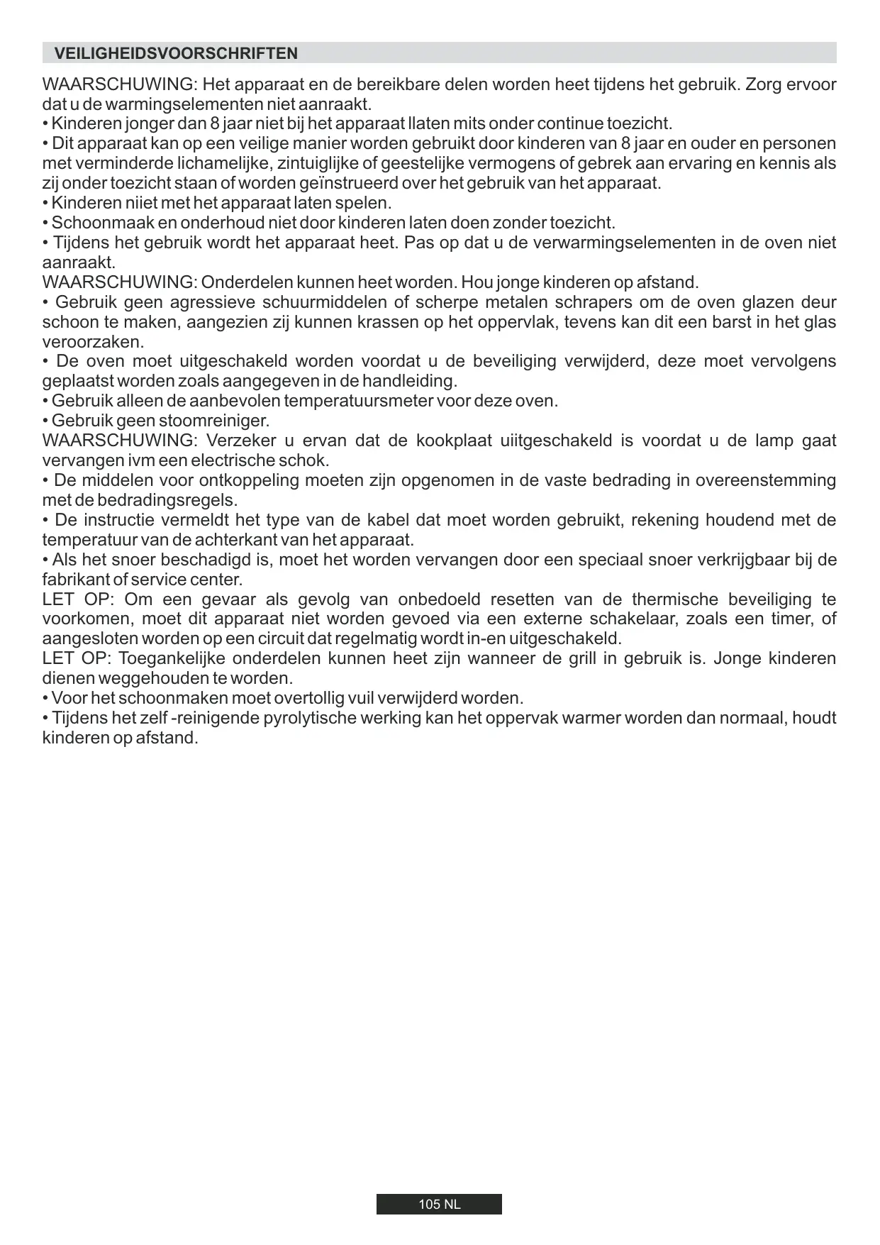 - Tijdens het zelf -reinigende pyrolytische werking kan het oppervak warmer worden dan normaal, houdt kinderen op afstand. 105 NL