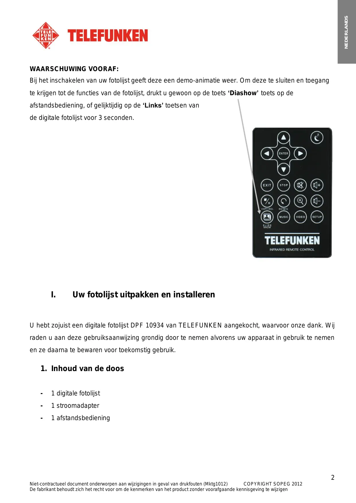Niet-contractueel document onderworpen aan wijzigingen in geval van drukfouten (Mktg1012) COPYRIGHT SOPEG 2012 De fabrikant behoudt zich het recht voor om de kenmerken van het product zonder voorafgaande kennisgeving te wijzigen NEDERLANDS WAARSCHUWING VOORAF: Bij het inschakelen van uw fotolijst geeft deze een demo-animatie weer. Om deze te sluiten en toegang te krijgen tot de functies van de fotolijst, drukt u gewoon op de toets ‘Diashow’ toets op de afstandsbediening, of gelijktijdig op de ‘Links’ toetsen van de digitale fotolijst voor 3 seconden.