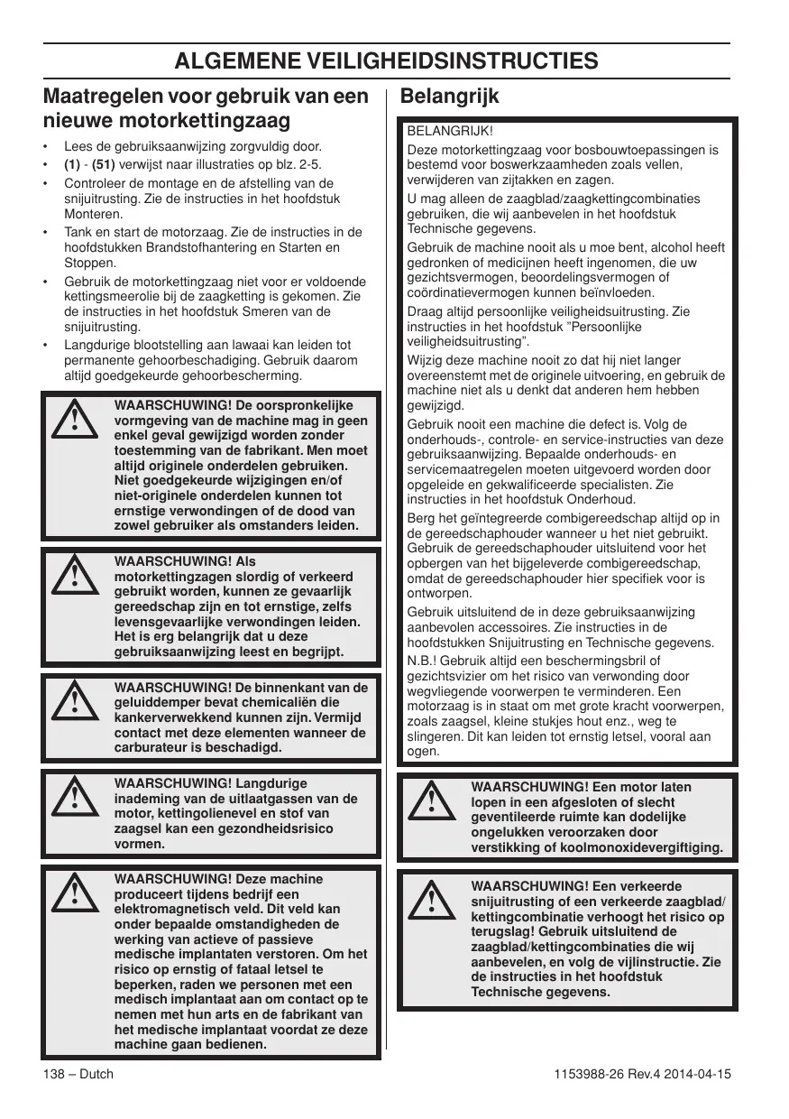 Dutch – 137 ALGEMENE VEILIGHEIDSINSTRUCTIES Maatregelen voor gebruik van een nieuwe motorkettingzaag