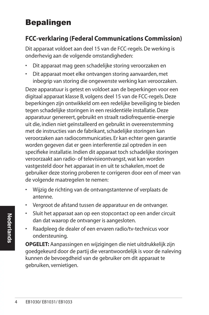 Dit apparaat mag geen schadelijke storing veroorzaken en Dit apparaat moet elke ontvangen storing aanvaarden, met inbegrip van storing die ongewenste werking kan veroorzaken. Deze apparatuur is getest en voldoet aan de beperkingen voor een digitaal apparaat klasse B, volgens deel 15 van de FCC-regels. Deze beperkingen zijn ontwikkeld om een redelijke beveiliging te bieden tegen schadelijke storingen in een residentiële installatie. Deze apparatuur genereert, gebruikt en straalt radiofrequentie-energie uit die, indien niet geïnstalleerd en gebruikt in overeenstemming met de instructies van de fabrikant, schadelijke storingen kan veroorzaken aan radiocommunicaties. Er kan echter geen garantie worden gegeven dat er geen interferentie zal optreden in een specifieke installatie. Indien dit apparaat toch schadelijke storingen veroorzaakt aan radio- of televisieontvangst, wat kan worden vastgesteld door het apparaat in en uit te schakelen, moet de gebruiker deze storing proberen te corrigeren door een of meer van de volgende maatregelen te nemen:
