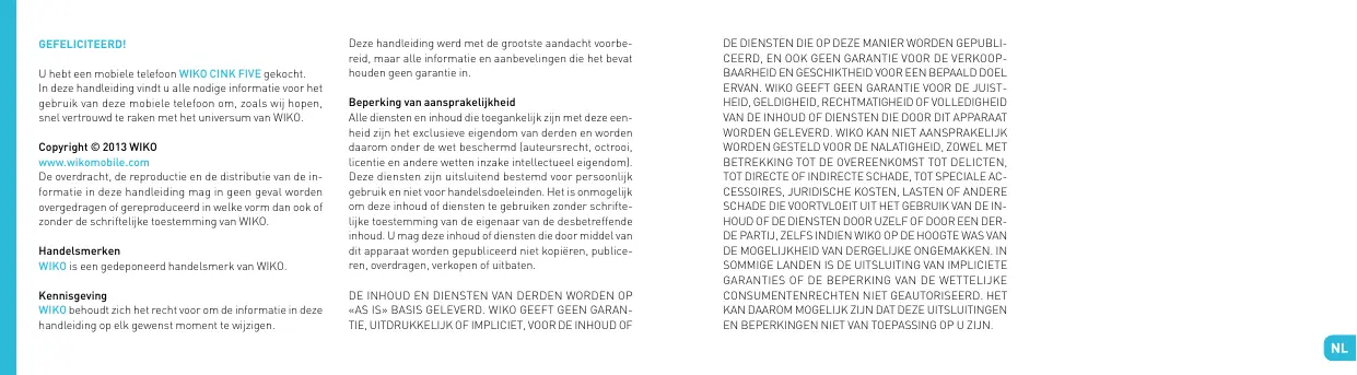DE DIENSTEN DIE OP DEZE MANIER WORDN GEUPLIE-CERD, EN OOK GEEN GARANTIE VOOR DE VERKOOP-BAARHEID EN GESCHIKTHEID VOOR EEEN BEPAALD DOEL ERVAN. WIKO GEEFT EN GANRARITY VOOR DE JUISTHEID, GELDIGHEID, RECHTMATIGHEID OF VOLLEDIGHEID VAN DE INHOUOD OF DIENSTEN DIE DOOR DIT APPARATI WORDEN GELEVERD. WIKO KAN NIET AANSPRAKELIJK WORDEN GESTEULOD DE NALATIGHEID, ZOWEL MET BETREKKING TOT DE OVEREENKOMST TOT DELICENT, TOT DIRECTE OF INDIRECTE SCHADE, TOT SPECIALE ACCESSIORES, JURIDISCHE KOSTEN, LASTEN OF ANDERE SCHADE DIE VOORTVLOEIT UIT HET GEBRUK VAN DE INHOUOD OF DE DIENSTEN DOU ZEUL OF DOOR EEEN DERDE PARTIJZ, ZELFS INDIENT WIKO DE OP DE HOOGTE WAS VAN DE MOGELIJKHEID VAN DERGELJKE ONGEMAKKEN. IN SOMMIGE LANDEN IS DE UITSLUITING VAN IMPLICIETE GARANTIES DE BEPERKING VAN DE WETTELJUK CONSUMENTENREchten NIET GEAUTORISEER. HET KAN DAAROM MOGELIJK ZIJN DAT DEZE UITSLUITINGEN EN BEPERKINGEN NIET VAN TOEPASSING OP U ZIJN.