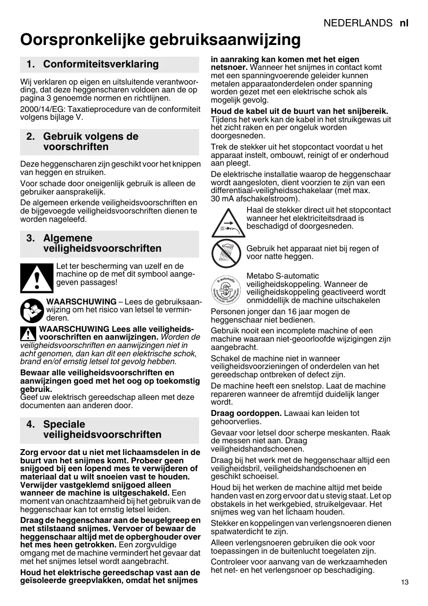 De elektrische installmentaarop de heggenschaar wordt aangesloten, dient voorzien te zijn van een differentiaal-veiligheidsschakelaar (met max. 30 mAfschakelstroom).
