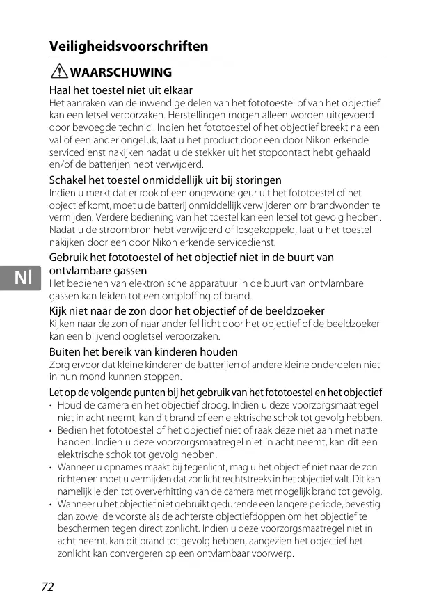 Indien u merkt dat er rock of een ongewane geur uit het fototoestel of het objectiefkomt, moetu de batterj onmiddellik vensijderen om brandiwonden te vermijden. Verdere bediening van het toestel kan een letsel tot gevolg hebben. Nadat u de stroombron hebt verwijderd of losgekoppeld, laat u het toestel nakiken door een door Nikon erkende servicedienst.