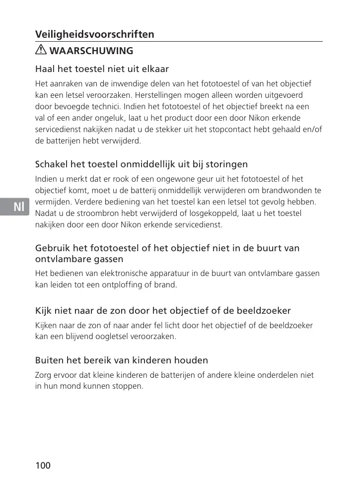 • Bedien het fototoestel of het objectief niet of raak deze niet aan met natte handen. Indien u deze voorzorgsmaatregel niet in acht neemt, kan dit een elektrische schok tot gevolg hebben. • Wanneer u opnames maakt bij tegenlicht, mag u het objectief niet naar de zon richten en moet u vermijden dat zonlicht rechtstreeks in het objectief valt. De Fr Es Se Ru Nl It Ck Bedankt voor de aankoop van het AF-S NIKKOR 200mm f/2G ED VRⅡ-objectief. Lees deze instructies eerst door en raadpleeg de gebruikshandleiding van uw camera alvorens u dit objectief gebruikt.