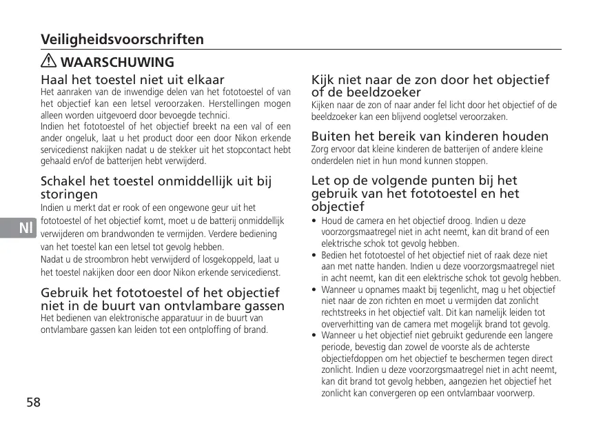 Gebruik het fototoestel of het objectief niet in de buurt van ontvlambare gassen Het bedienen van elektronische apparatuur in de buur van ontlambare gassen kan leiden tot een ontploffing of brand