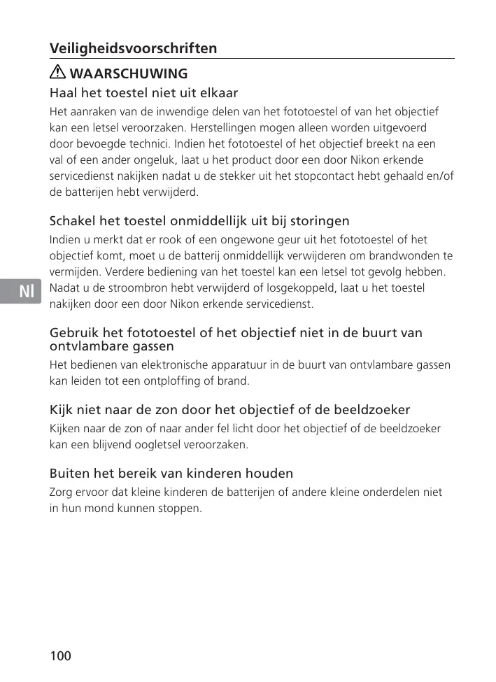 En De Fr Es Se Ru Nl It Ck De Fr Es Se Ru Nl It Ck En De Fr Es Se Ru Nl It Ck Si vous remarquez de la fumée ou une odeur inhabituelle se dégageant de l’appareil photo ou de l’objectif, retirez immédiatement les piles, en prenant soin de ne pas vous brûler. Continuer d’utiliser son matériel peut entraîner des blessures. Après avoir retiré ou débranché la source d’alimentation, confiez le produit à un centre de service agréé Nikon pour le faire vérifier.
