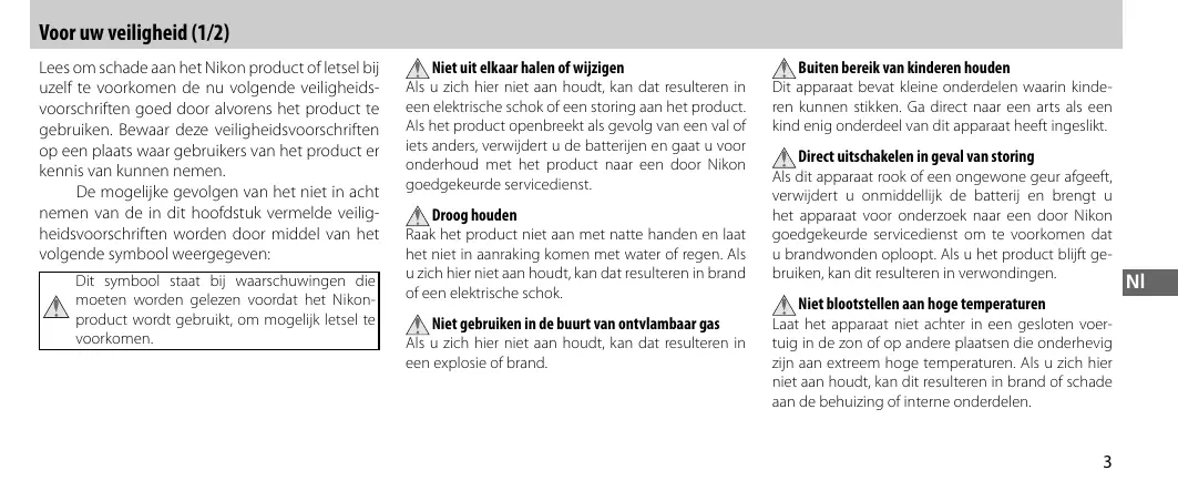 Le non-respect de cette précaution peut avoir pour conséquence une décharge électrique ou un dysfonctionnement du produit. Si le produit se brise suite à une chute ou tout autre accident, retirez les piles et portez-le à un centre service Nikon agréé pour le faire inspecter. Conserver le produit à l’abri de l’humidité Ne manipulez pas le produit avec les mains mouillées, ne l’immergez pas et ne l’exposez pas à l’eau ou à la pluie. Le non-respect de cette précaution peut causer un incendie ou une décharge électrique. Ne pas utiliser le produit en présence de gaz inflammables Le non-respect de cette précaution peut causer une explosion ou un incendie.