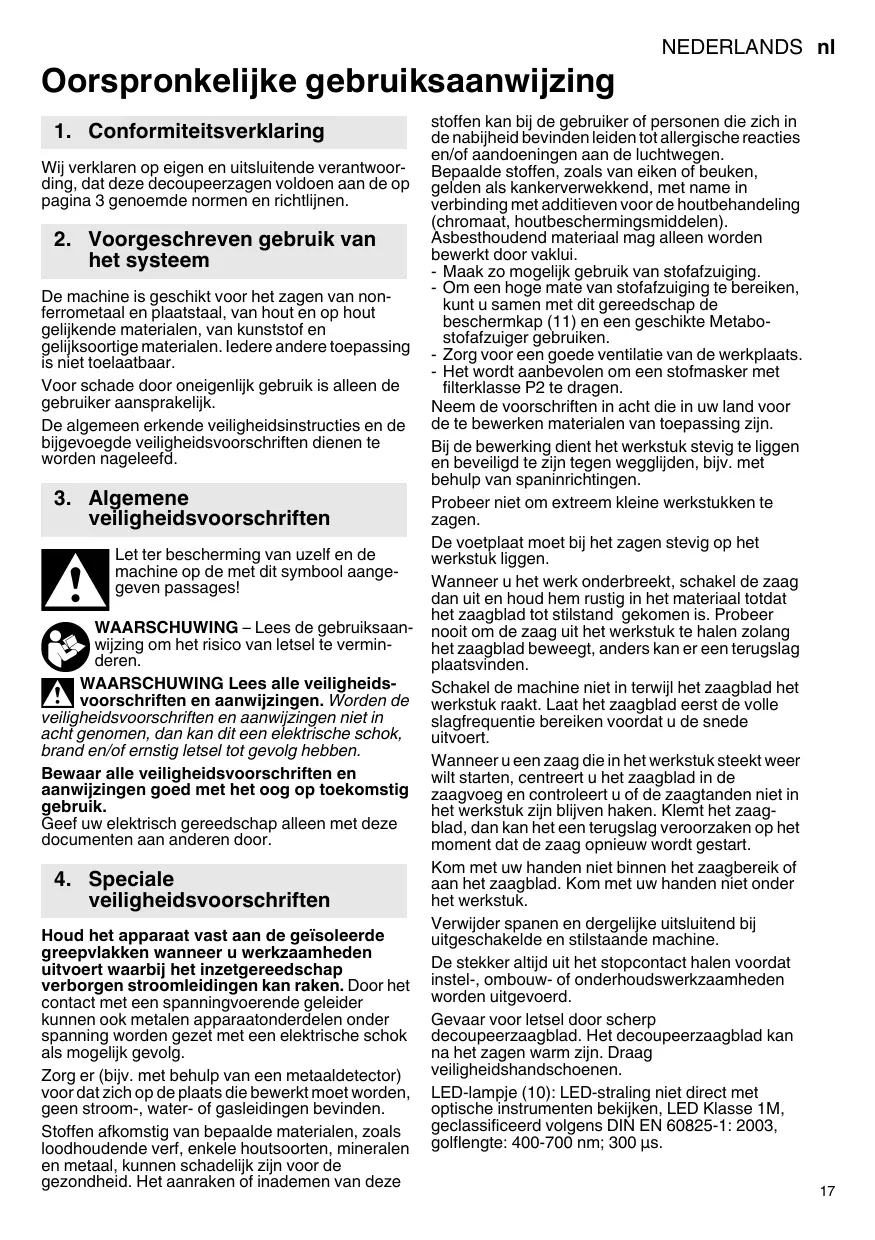 De machine is geschikt voor het zagen van non-ferrometaal enplaatstaal, van hout en op hout gelijkende materialen, van kunststof en gelijksoortige materialen. Ledere andere toepassing is nicht toelaatbaar.