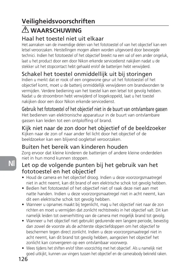 Teile, in die leicht Staub, Schmutz und Wasser eindringen können. • Reinigen Sie Glasflächen mit einem Blasepinsel. Staub und hartnäckige Verunreinigungen sollten mit einem sauberen, weichen Remarques concernant une utilisation en toute sécurité ATTENTION Ne pas démonter Le fait de toucher aux pièces internes de l’appareil ou de l’objectif pourrait entraîner des blessures. Les réparations doivent être effectuées par des techniciens qualifiés. Si l’appareil ou l’objectif est cassé suite à une chute ou un autre accident, apportez le produit dans un centre de service agréé Nikon pour le faire vérifier après avoir débranché le produit et retiré les piles.