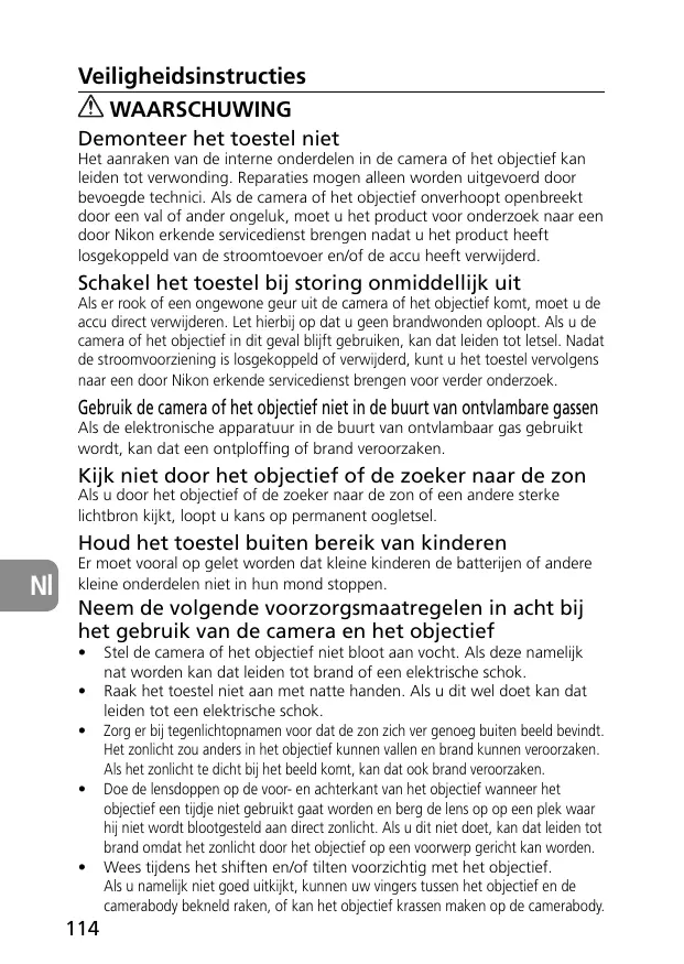 Éteignez immédiatement en cas de dysfonctionnement Si de la fumée ou une odeur inhabituelle se dégage de l'appareil photo ou de l'objectif, retirez immédiatement l'accumulateur ou les piles en prenant soin de ne pas vous brûler. Toute continuation prolongée de l'appareil peut provoquer des blessures. Après avoir retiré ou débranché la source d'alimentation, confiez votre matériel pour inspection à un centre de service agréé Nikon.