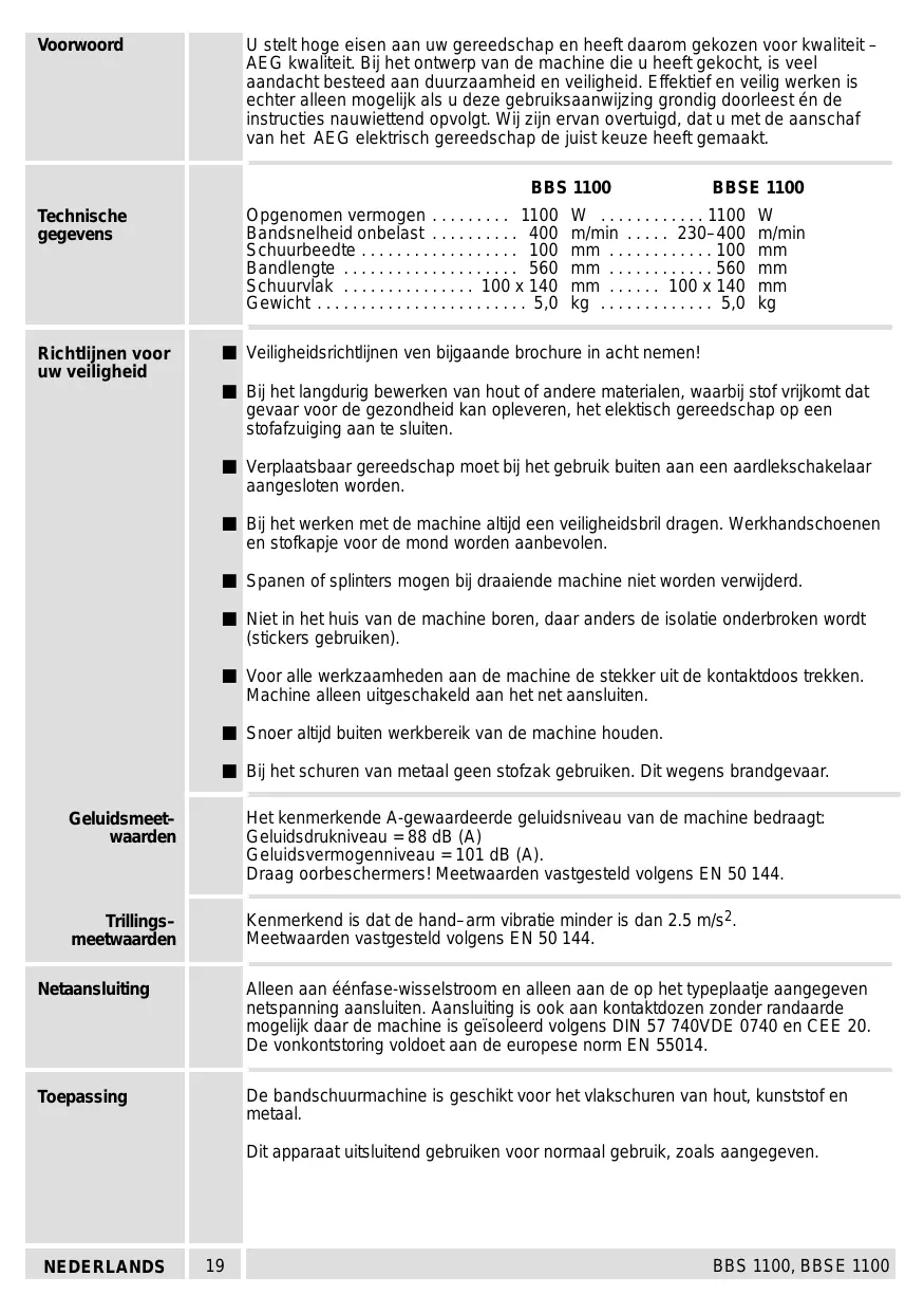 U stelt hoge eisen aan uw gereedschap en heeft daarom gekozen voor kwaliteit - AEG kwallteit. Bij het ontwerp van de machine die u heeft gekocht, is veel aandacht besteed aan duurzaamheid en velligheid. Effektief en veilig werken is echter alleen mogelik als u deze gebruiksaanwijzing grondig doorieest én de instructies nauwiettend opvolgt. Wij zin ervan overtuigd, dat u met de aanschaf van het AEG elektisch gereedschap de juist keuze heeft gemaakt. BBS 1100 BBSE 1100 Opgenomen vermogen ..…..... 1100 W 1100 W Bandsnelheid onbelast m/min S chuurbeedte mm Bandlengte .…. mm Schuurviak mm Gewicht 0 kg Veiligheïdsrichtiinen ven bijgaande brochure in acht nemen! Bij het langdurig bewerken van hout of andere materialen, waarbi stof vrikomt dat gevaar voor de gezondheid kan opleveren, het elektisch gereedschap op een Stofafzuiging aan te sluiten. Verplaatsbaar gereedschap moet bi het gebruik buiten aan een aardiekschakelaar aangesloten worden. Bi het werken met de machine altjd een veiligheidsbril dragen. Werkhandschoenen en stofkapje voor de mond worden aanbevolen. Spanen of splinters mogen bi draaiende machine niet worden verwiderd. Niet in het huis van de machine boren, daar anders de isolatie onderbroken wordt (stickers gebruiken) Voor alle werkzaamheden aan de machine de stekker uit de kontaktdoos trekken. Machine alleen uitgeschakeld aan het net aansluiten. Snoer altid buiten werkbereik van de machine houden. Bij het schuren van metaal geen stofzak gebruiken. Dit wegens brandgevaar. Het kenmerkende A-gewaardeerde geluidsniveau van de machine bedraagt: Geluidsdrukniveau =88 dB (A) Geluidsvermogenniveau = 101 dB (A). Draag oorbeschermers! Meetwaarden vastgesteld volgens EN 50 144. Kenmerkend is dat de hand-arm vibratie minder is dan 2.5 m/s2 Meetwaarden vastgesteld volgens EN 50 144. Alleen aan éénfase-wisselstroom en alleen aan de op het typeplaatie aangegeven netspanning aansluiten. Aansluïting is ook aan kontaktdozen zonder randaarde mogelijk daar de machine is geïsoleerd volgens DIN 57 740VDE 0740 en CEE 20. De vonkontstoring voldoet aan de europese norm EN 55014. De bandschuurmachine is geschikt voor het vlakschuren van hout, kunststof en metaal. Dit apparaat uitsluitend gebruiken voor normaal gebruik, zoals aangegeven BBS 1100, BBSE 1100