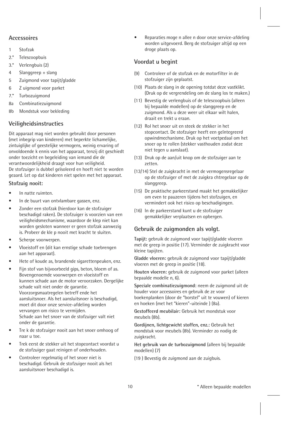 M ondstuk voor be k l e ding Control e e r of de stofzak e n de m otorfil te r in de stofzuige r zijn ge pl aatst. (11) Be ve stig de ve rl e ngbuis of de te l e scoopbuis (al een bij be paal de m ode l e n) op de sl anggre e p e n de zuigm ond. Al s u de ze w e e r uit e l k aar w il t h al e n, draait e n tre k t u e raan. Ve il igh e idsinstructie s (12) Rolh e t snoe r uit e n ste e k de ste k k e r in h e t stopcontact. D e stofzuige r h e e ft e e n ge ïnte gre e rd opw indm e ch anism e . D ruk op h e t voe tpe daalom h e t snoe r op te rol e n (ste k k e r vasth oude n zodat de ze nie t te ge n u aansl aat). D it apparaat m ag nie t w orde n ge bruik t door pe rsone n (m e t inbe grip van k inde re n) m e t be pe rk te l ich am e l ijk e , zintuigl ijk e of ge e ste l ijk e ve rm oge ns, w e inig e rvaring of onvol doe nde k e nnis van h e t apparaat, te nzij dit ge sch ie dt onde r toe zich t e n be ge l e iding van ie m and die de ve rantw oorde l ijk h e id draagt voor h un ve il igh e id. D e stofzuige r is dubbe lge ïsol e e rd e n h oe ft nie t te w orde n ge aard. Le t op dat k inde re n nie t spe l e n m e t h e t apparaat. (13) D ruk op de aan/uit k nop om de stofzuige r aan te ze tte n. (13/14) Ste lde zuigk rach t in m e t de ve rm oge nsre ge l aar op de stofzuige r of m e t de zuigk ra ch tre ge l aar op de anggre e p. Stofzuig nooit: (15) D e prak tisch e park e e rstand m aak t h e t ge m ak k e l ijk e r om e ve n te pauze re n tijde ns h e t stofzuige n, e n ve rm inde rt ook h e t risico op be sch adiginge n.