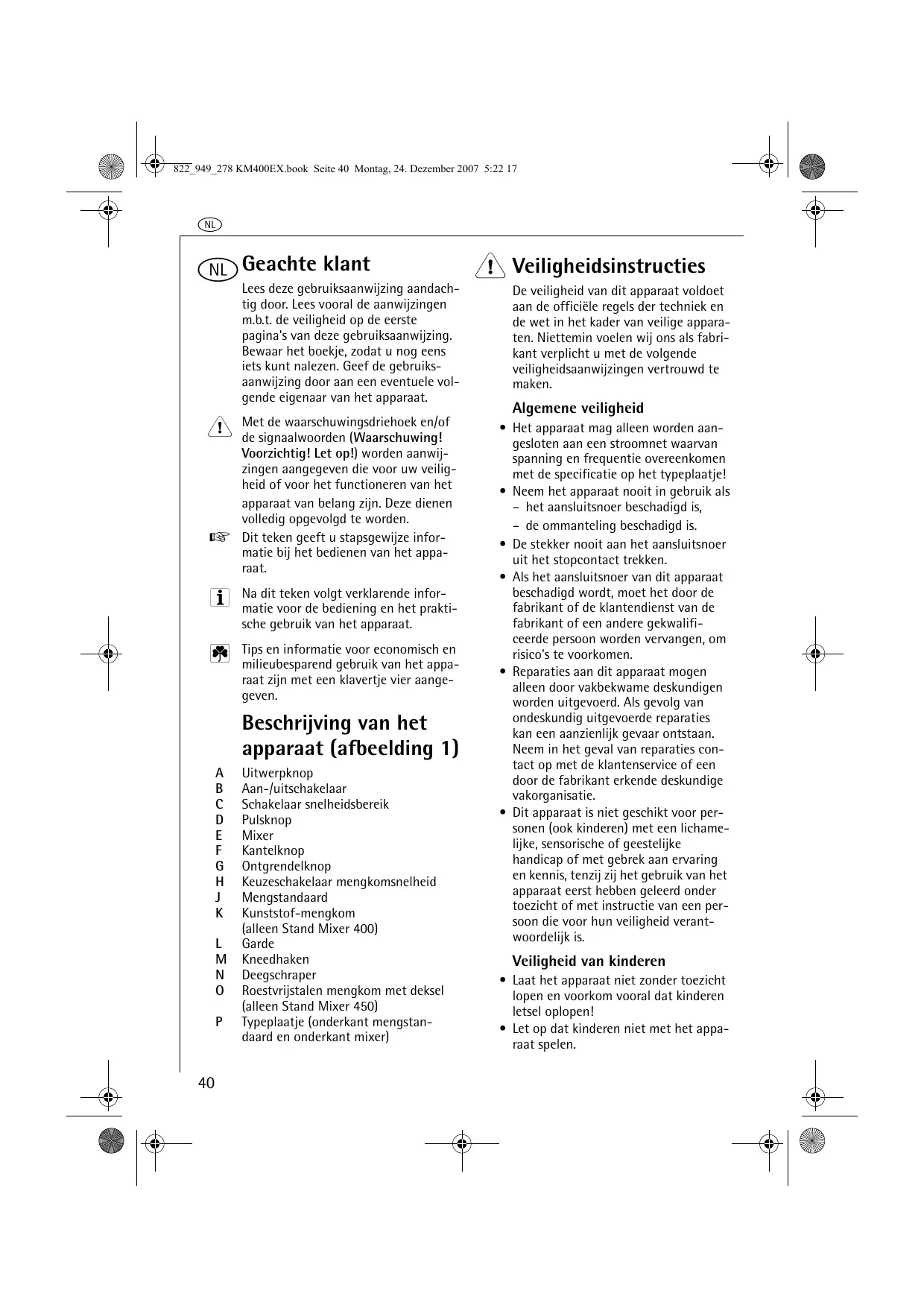 Uitwerpknop Aan-/uitschakelaar Schakelaar snelheidsbereik Pulsknop Mixer Kantelknop Ontgrendelknop Keuzeschakelaar mengkomsnelheid Mengstandaard Kunststof-mengkom (alleen Stand Mixer 400) Garde Kneedhaken Deegschraper Roestvrijstalen mengkom met deksel (alleen Stand Mixer 450) Typeplaatje (onderkant mengstandaard en onderkant mixer) Algemene veiligheid Veiligheid van kinderen