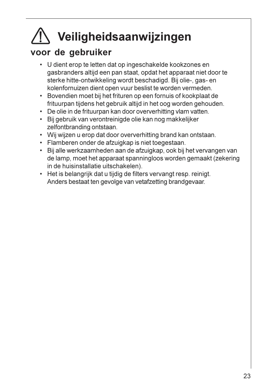 ÂÀ Veiligheidsaanwijzingen voor de gebruiker +_U dient erop te letten dat op ingeschakelde kookzones en gasbranders altijd een pan staat, opdat het apparaat niet door te sterke hitte-ontwikkeling wordt beschadigd. Bij olie-, gas-en kolenfornuizen dient open vuur beslist te worden vermeden. *_Bovendien moet bij het frituren op een fornuis of kookplaat de frituurpan tijdens het gebruik altijd in het oog worden gehouden. + _ Deoliein de frituurpan kan door oververhitting vlam vatten. *_ Bij gebruik van verontreinigde olie kan nog makkelijker zelfontbranding ontstaan. + Wij wijzen u erop dat door oververhitting brand kan ontstaan. + Flamberen onder de afzuigkap is niet toegestaan. + _Bijalle werkzaamheden aan de afzuigkap, ook bij het vervangen van de lamp, moet het apparaat spanningloos worden gemaakt (zekering in de huisinstallatie uitschakelen). + Hetis belangrijk dat u tijdig de filters vervangt resp. reinigt. Anders bestaat ten gevolge van vetafzetting brandgevaar.