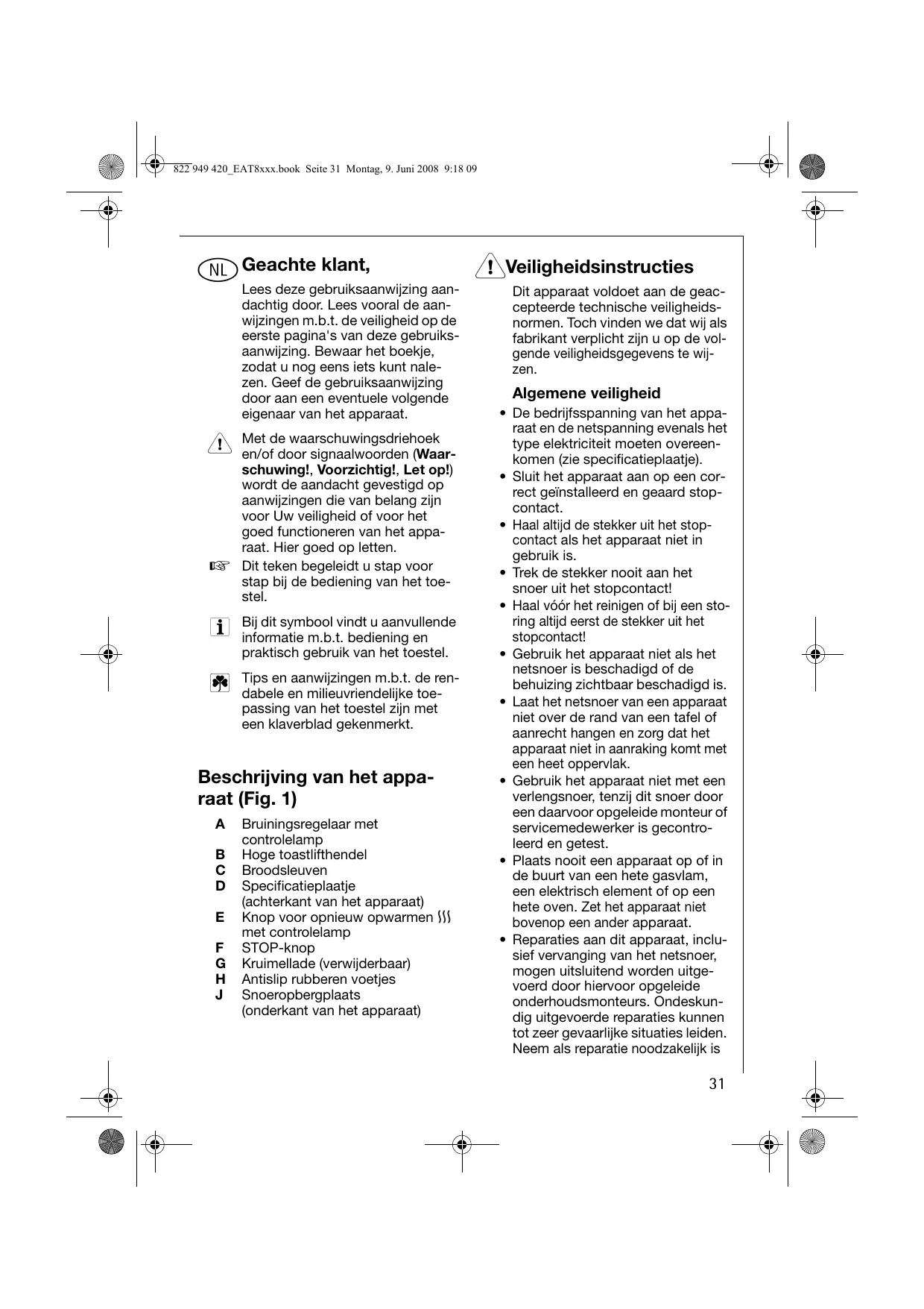 Bruiningsregelaar met controlelamp Hoge toastlifthendel Broodsleuven Specificatieplaatje (achterkant van het apparaat) Knop voor opnieuw opwarmen met controlelamp STOP-knop Kruimellade (verwijderbaar) Antislip rubberen voetjes Snoeropbergplaats (onderkant van het apparaat) 1Veiligheidsinstructies Dit apparaat voldoet aan de geaccepteerde technische veiligheidsnormen. Toch vinden we dat wij als fabrikant verplicht zijn u op de volgende veiligheidsgegevens te wijzen. Algemene veiligheid