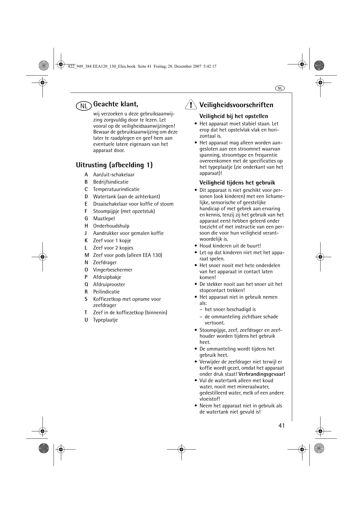 Aan/uit-schakelaar Bedrijfsindicatie Temperatuurindicatie Watertank (aan de achterkant) Draaischakelaar voor koffie of stoom Stoompijpje (met opzetstuk) Maatlepel Onderhoudshulp Aandrukker voor gemalen koffie Zeef voor 1 kopje Zeef voor 2 kopjes Zeef voor pods (alleen EEA 130) Zeefdrager Vingerbeschermer Afdruipbakje Afdruiprooster Peilindicatie Koffiezetkop met opname voor zeefdrager T Zeef in de koffiezetkop (binnenin) U Typeplaatje 1 Veiligheidsvoorschriften Veiligheid bij het opstellen