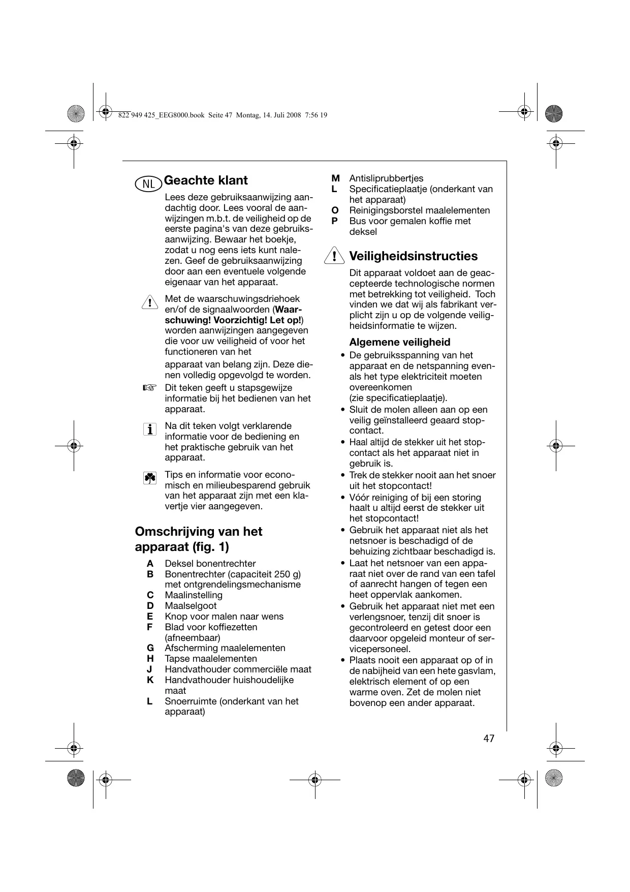 - Controller de bonentrechter (fig. 1/ B) op de aanwezigheid van vreemde voorwerpen voordat u de molenGaat gebruiken.