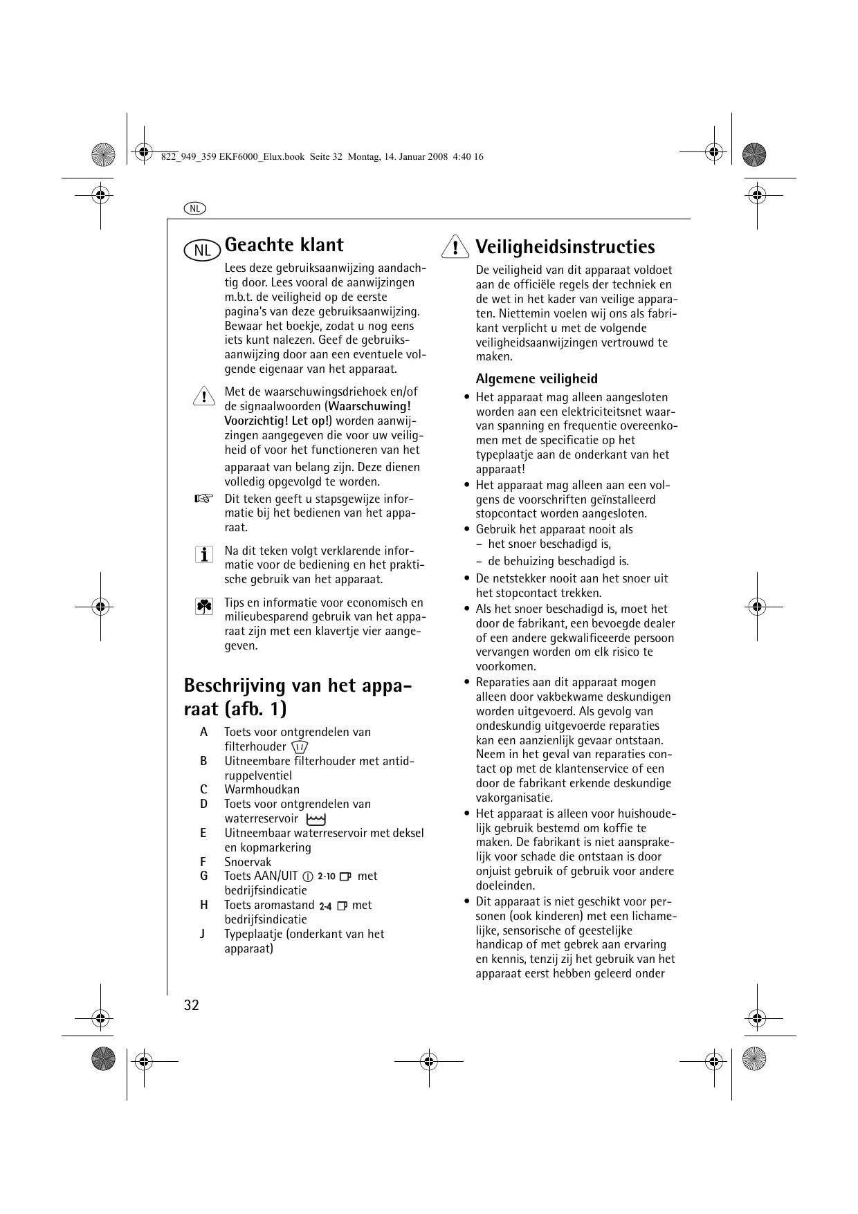 Toets voor ontgrendelen van filterhouder Uitneembare filterhouder met antidruppelventiel Warmhoudkan Toets voor ontgrendelen van waterreservoir Uitneembaar waterreservoir met deksel en kopmarkering Snoervak Toets AAN/UIT met bedrijfsindicatie Toets aromastand met bedrijfsindicatie Typeplaatje (onderkant van het apparaat) Algemene veiligheid 822_949_359 EKF6000_Elux.book Seite 33 Montag, 14. Januar 2008 4:40 16