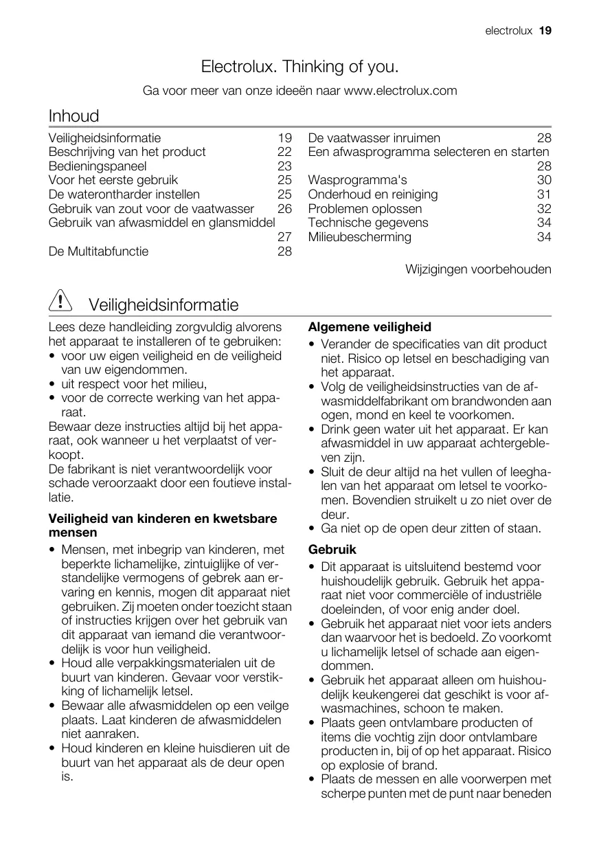 De vaatwasser inruimen Een afwasprogramma selecteren en starten Wasprogramma's Onderhoud en reiniging Problemen oplossen Technische gegevens Milieubescherming Wijzigingen voorbehouden Veiligheidsinformatie Lees deze handleiding zorgvuldig alvorens het apparaat te installeren of te gebruiken: