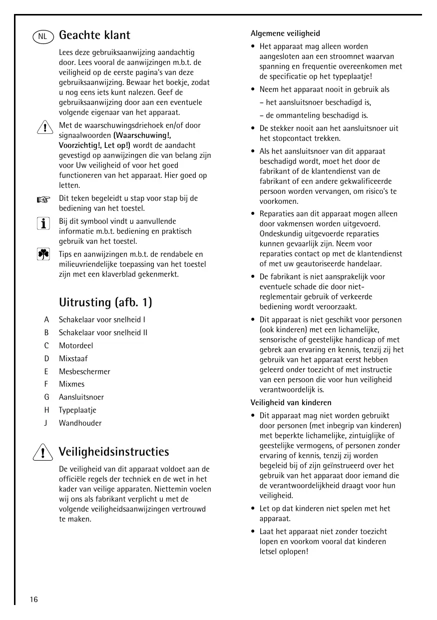 Ge ach te k l ant Le e s de ze ge bruik saanw ijzing aandach tig door. Le e s vooralde aanw ijzinge n m .b.t. de ve il igh e id op de e e rste pagina's van de ze ge bruik saanw ijzing. Be w aar h e t boe k je , zodat u nog e e ns ie ts k unt nal e ze n. Ge e f de ge bruik saanw ijzing door aan e e n e ve ntue l vol ge nde e ige naar van h e t apparaat. M e t de w aarsch uw ingsdrie h oe k e n/of door signaal w oorde n (W aarsch uw ing!, Voorzich tig!, Le t op!) w ordt de aandach t ge ve stigd op aanw ijzinge n die van be l ang zijn voor Uw ve il igh e id of voor h e t goe d functione re n van h e t apparaat. H ie r goe d op e tte n. D it te k e n be ge l e idt u stap voor stap bij de be die ning van h e t toe ste l Bij dit sym boolvindt u aanvul e nde inform atie m .b.t. be die ning e n prak tisch ge bruik van h e t toe ste l Tips e n aanw ijzinge n m .b.t. de re ndabe l e en m il ie uvrie nde l ijk e toe passing van h e t toe ste l zijn m e t e e n k l ave rbl ad ge k e nm e rk t. Uitrusting (afb. 1)