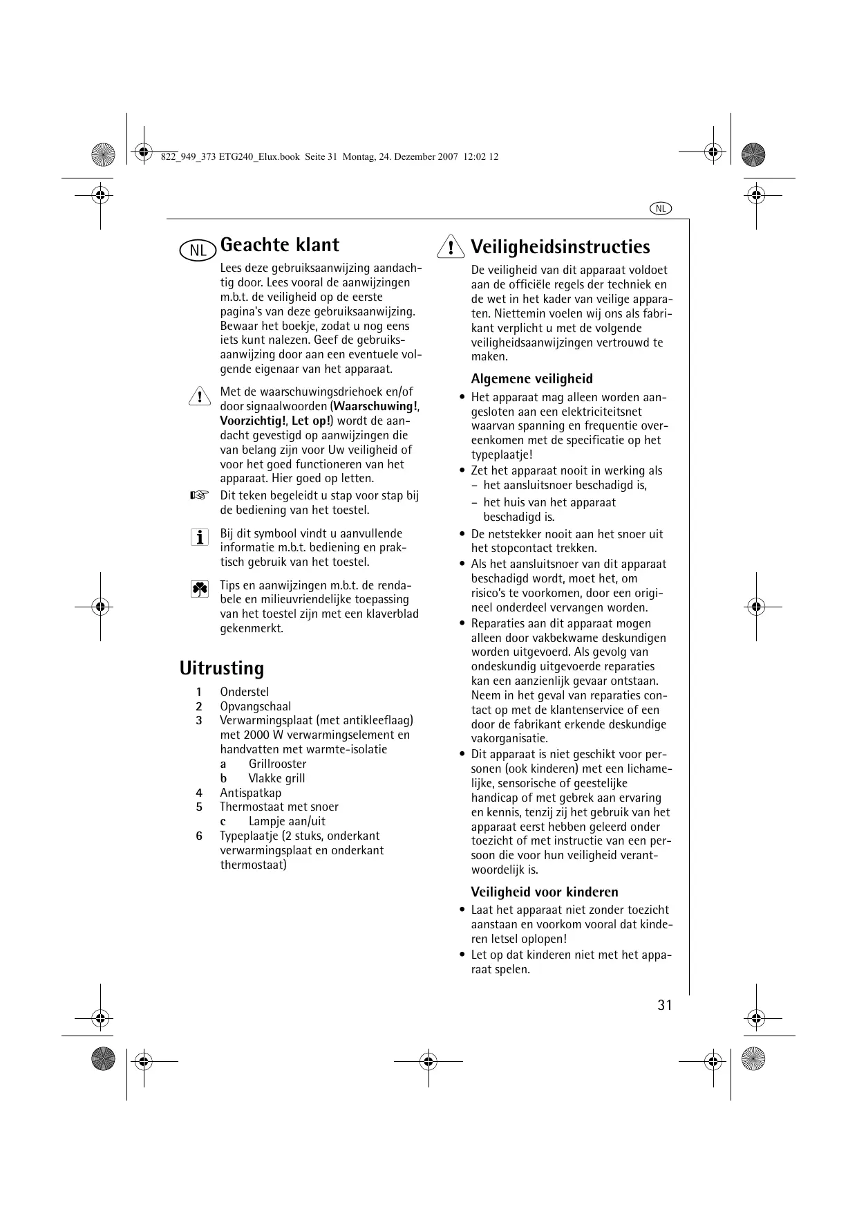 op het product of Het symbool op de verpakking wijst erop dat dit product niet als huishoudafval mag worden behandeld. Het moet echter naar een plaats worden gebracht waar elektrische en elektronische apparatuur wordt gerecycled. Als u ervoor zorgt dat dit product op de correcte manier wordt verwijderd, voorkomt u mogelijk voor mens en milieu negatieve gevolgen die zich zouden kunnen voordoen in geval van verkeerde afvalbehandeling. Voor meer details in verband met het recyclen van dit product, neemt u het best contact op met de gemeentelijke instanties, het bedrijf of de dienst belast met de verwijdering van huishoudafval of de winkel waar u het product hebt gekocht. 822_949_373 ETG240_Elux.book Seite 33 Montag, 24. Dezember 2007 12:02 12