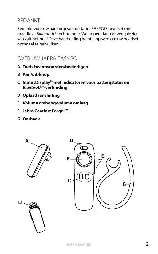 C StatusDisplayTM avec voyants d’état de batterie et de connexion Bluetooth®. D Prise de charge E Commande de volume haut/bas F Jabra Comfort EargelTM G Crochet auriculaire