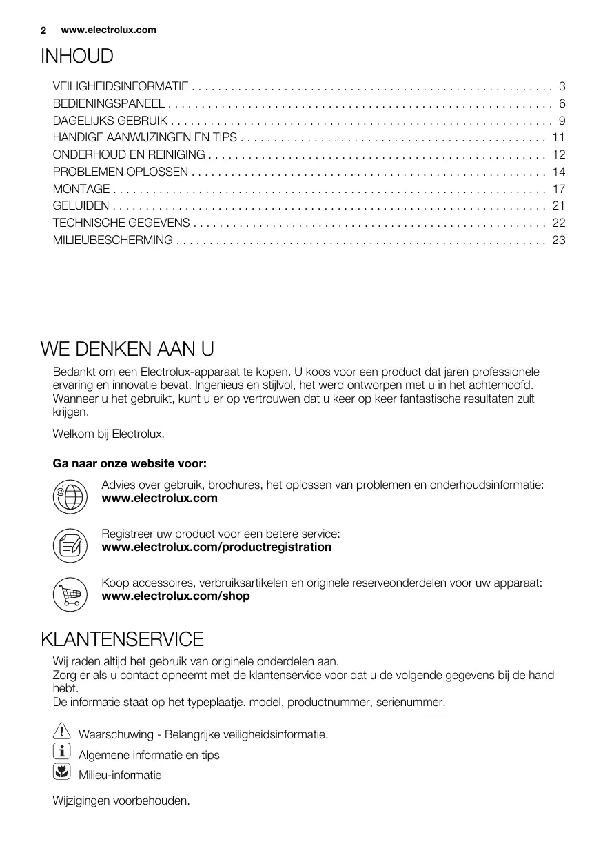 Bedankt om een Electrolux-apparaat te kopen. U koos voor een product dat jaren professionele ervaring en innovatie bevat. Ingenieus en stijlvol, het werd ontworpen met u in het achterhoofd. Wanneer u het gebruikt, kunt u er op vertrouwen dat u keer op keer fantastische resultaten zult krijgen. Welkom bij Electrolux. Ga naar onze website voor: Advies over gebruik, brochures, het oplossen van problemen en onderhoudsinformatie: www.electrolux.com Registreer uw product voor een betere service: www.electrolux.com/productregistration Koop accessoires, verbruiksartikelen en originele reserveonderdelen voor uw apparaat: www.electrolux.com/shop KLANTENSERVICE Wij raden altijd het gebruik van originele onderdelen aan. Zorg er als u contact opneemt met de klantenservice voor dat u de volgende gegevens bij de hand hebt. De informatie staat op het typeplaatje. model, productnummer, serienummer. Waarschuwing - Belangrijke veiligheidsinformatie. Algemene informatie en tips Milieu-informatie Wijzigingen voorbehouden. NEDERLANDS