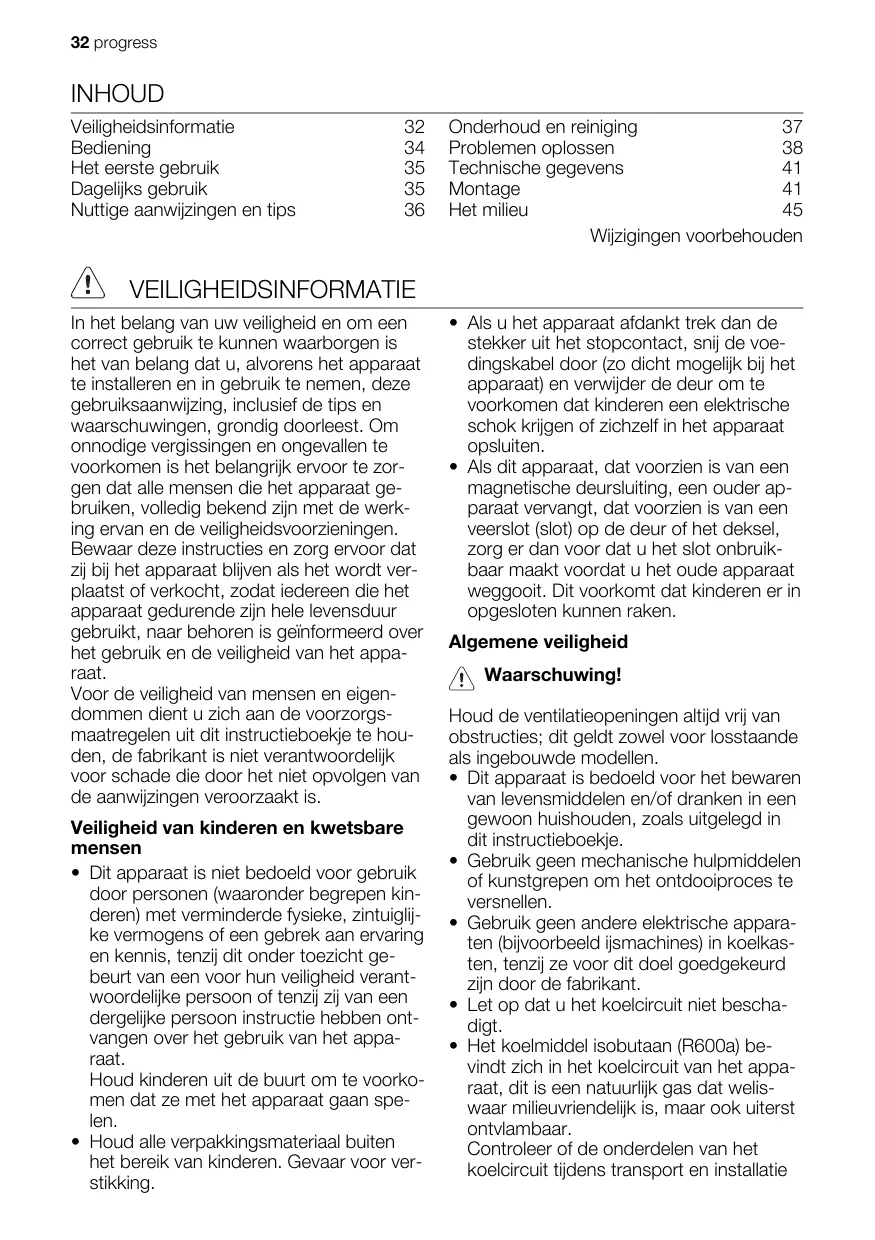 - Het koelmiddel isobutaan (R600a) bevindt zich in het koelcircuit van het apparaat, dit is een natuurlijk gas dat weliswaar milieuvriendelijk is, maar ook uiterst ontvlambaar. Controleer of de onderdelen van het koelcircuit tijdens transport en installatie progress 33 van het apparaat niet beschadigd zijn geraakt. Indien het koelcircuit beschadigd is: – open vuur en ontstekingsbronnen vermijden – de ruimte waar het apparaat zich bevindt grondig ventileren