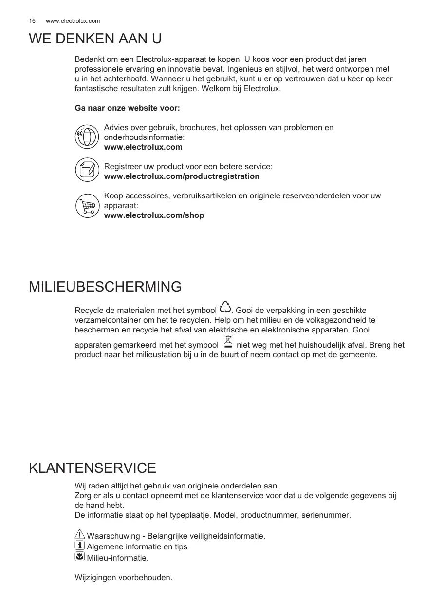 WE DENKEN AAN U Bedankt om een Electrolux-apparaat te kopen. U koos voor een product dat jaren professionele ervaring en innovatie bevat. Ingenieus en stilvol, het werd ontworpen met U in het achterhoofd. Wanneer u het gebruikt, kunt u er op vertrouwen dat u keer op keer fantastische resultaten zult krijgen. Welkom bij Electrolux.