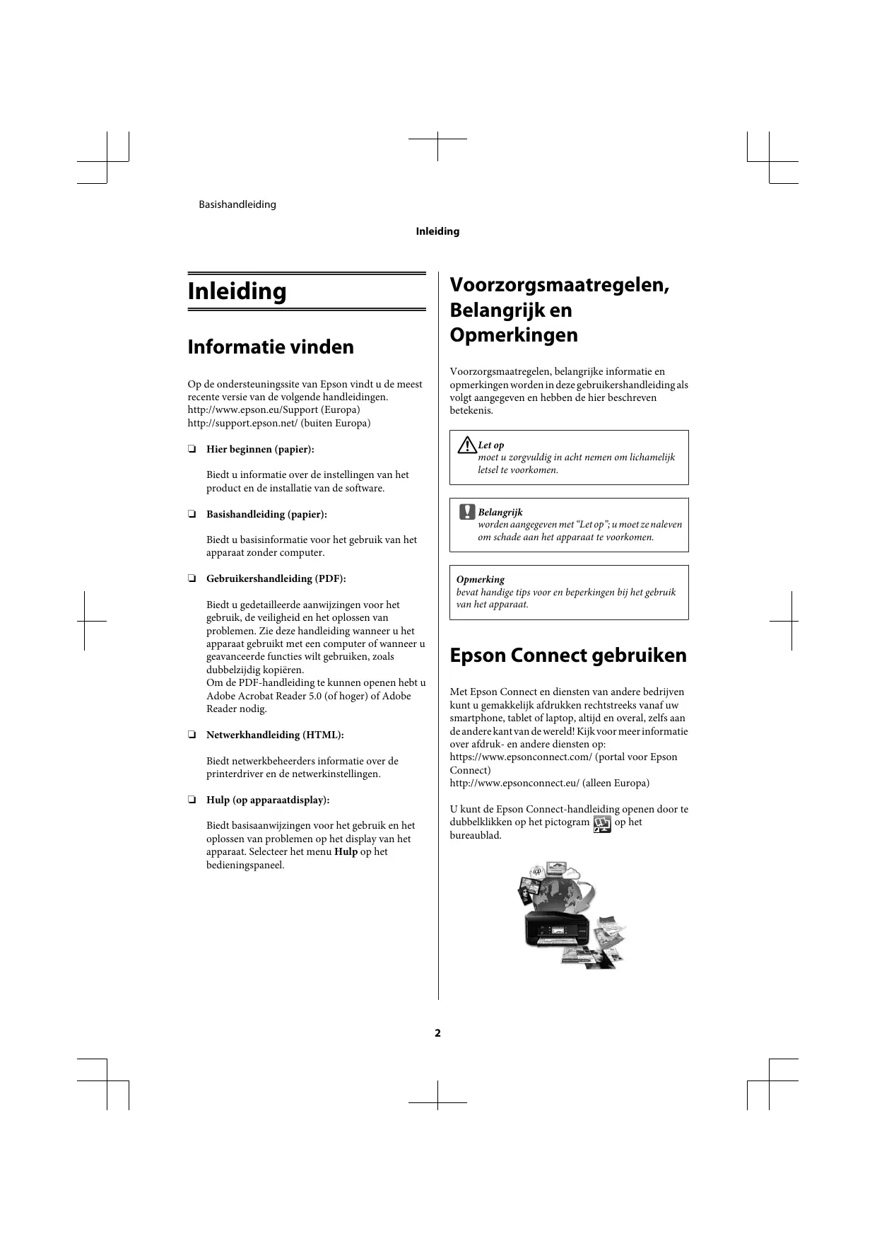!Let moet u zorgvuldig in acht nemen om lichamelijk ❏ Hier beginnen (papier): letsel te voorkomen. Biedt u informatie over de instellingen van het product en de installatie van de software. Belangrijk c worden aangegeven met “Let op”; u moet ze naleven ❏ Basishandleiding (papier): om schade aan het apparaat te voorkomen. Biedt u basisinformatie voor het gebruik van het apparaat zonder computer. ❏ Gebruikershandleiding (PDF): Opmerking bevat handige tips voor en beperkingen bij het gebruik van het apparaat. Biedt u gedetailleerde aanwijzingen voor het gebruik, de veiligheid en het oplossen van problemen. Zie deze handleiding wanneer u het apparaat gebruikt met een computer of wanneer u geavanceerde functies wilt gebruiken, zoals dubbelzijdig kopiëren. Om de PDF-handleiding te kunnen openen hebt u Adobe Acrobat Reader 5.0 (of hoger) of Adobe Reader nodig. Epson Connect gebruiken Met Epson Connect en diensten van andere bedrijven kunt u gemakkelijk afdrukken rechtstreeks vanaf uw smartphone, tablet of laptop, altijd en overal, zelfs aan de andere kant van de wereld! Kijk voor meer informatie over afdruk- en andere diensten op: https://www.epsonconnect.com/ (portal voor Epson Connect) http://www.epsonconnect.eu/ (alleen Europa) ❏ Netwerkhandleiding (HTML): Biedt netwerkbeheerders informatie over de printerdriver en de netwerkinstellingen. ❏ Hulp (op apparaatdisplay): U kunt de Epson Connect-handleiding openen door te dubbelklikken op het pictogram op het bureaublad. Biedt basisaanwijzingen voor het gebruik en het oplossen van problemen op het display van het apparaat. Selecteer het menu Hulp op het bedieningspaneel.