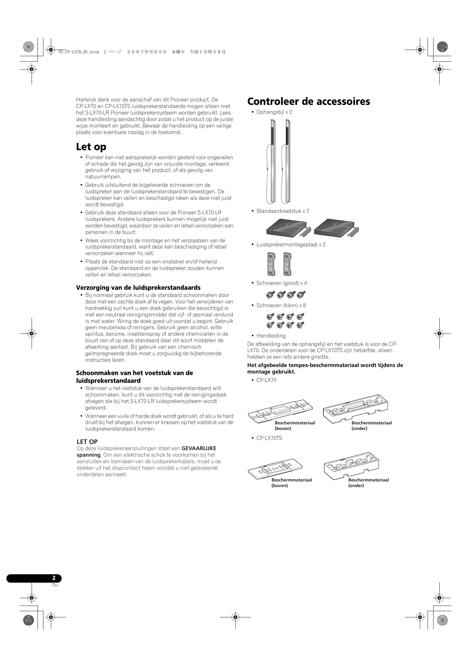 | & D5-UP-LXTO_DU. book 2 <—2 2007#9A5H 7kMH F1 OH5 82 Hartelijk dank voor de aanschaf van dit Pioneer product, De CP-LX70 en CP-LXTOTS luidsprekerstandaards mogen alleen met het S-LXT0-LR Pioneer luidsprekersysteem worden gebruikt. Lees deze handleiding aandachtig door zodat u het product op de juiste wijze monteert en gebruikt. Bewaar de handieiding op een veilige plaats voor eventuele naslag in de toekomst Let op Pioneer kan niet aansprakelijk worden gesteld voor ongevallen of schade die het gevolg zijn van onjuiste montage, verkeerd gebruik of wijziging van het product, of als gevolg van natuurrampen: Gebruik uitsluitend de bijgeleverde schroeven om de luidspreker aan de luidsprekerstandaard te bevestigen. De luidspreker kan vallen en beschadigd raken als deze niet juist wordt bevestigd. Gebruik deze standard alleen voor de Pioneer S-LX70-LR luidsprekers. Andere luidsprekers kunnen mogelijk niet juist worden bevestigd, waardoor ze vallen en letsel veroorzaken aan personen in de buurt Wees voorzichtig bij de montage en het verplaatsen van de luidsprekerstandaard, want deze kan beschadiging of letsel veroorzaken wanneer hi) valt Plaats de standaard niet op een onstabiel en/of hellend opperviak. De standaard en de luidspreker zouden kunnen vallen en letsel veroorzaken Verzorging van de luidsprekerstandaards + Bij normaal gebruik kunt u de standard schoonmaken door deze met een zachte doek af te vegen. Voor het verwijderen van hardnekkig vuil kunt u een doek gebruiken die bevochtigd is met een neutraal reinigingsmiddel dat vijf- of zesmaal verdund is met water. Wring de doek goed uit voordat u begint. Gebruik geen meubelwas of reinigers. Gebruik geen alcohol, witte spiritus, benzine, insektenspray of andere chemicaliën in de buurt van of op deze standaard daar dit soort middelen de afwerking aantast. Bij gebruik van een chemisch geimpregneerde doek moet u zorgvuldig de bijbehorende instructies lezen Schoonmaken van het voetstuk van de luidsprekerstandaard + Wanneer u het voetstuk van de luidsprekerstandaard wilt schoonmaken, kunt u dit voorzichtig met de reinigingsdoek afvegen die bij het S-LX70-LR luidsprekersysteem wordt geleverd + Wanneer een vuile of harde doek wordt gebruikt, of als u te hard drukt bij het afvegen, kunnen er krassen op het voetstuk van de luidsprekerstandaard komen. LET OP Op deze luidsprekeraansluitingen staat een GEVAARLUKE spanning. Om een elektrische schok te voorkomen bij het aansluiten en losmaken van de luidsprekerkabels, moet u de stekker uit het stopcontact halen voordat u niet geïsoleerde onderdelen aanraakt. Controleer de accessoires + Ophangstijl x 2 + Standaardvoetstuk x 2