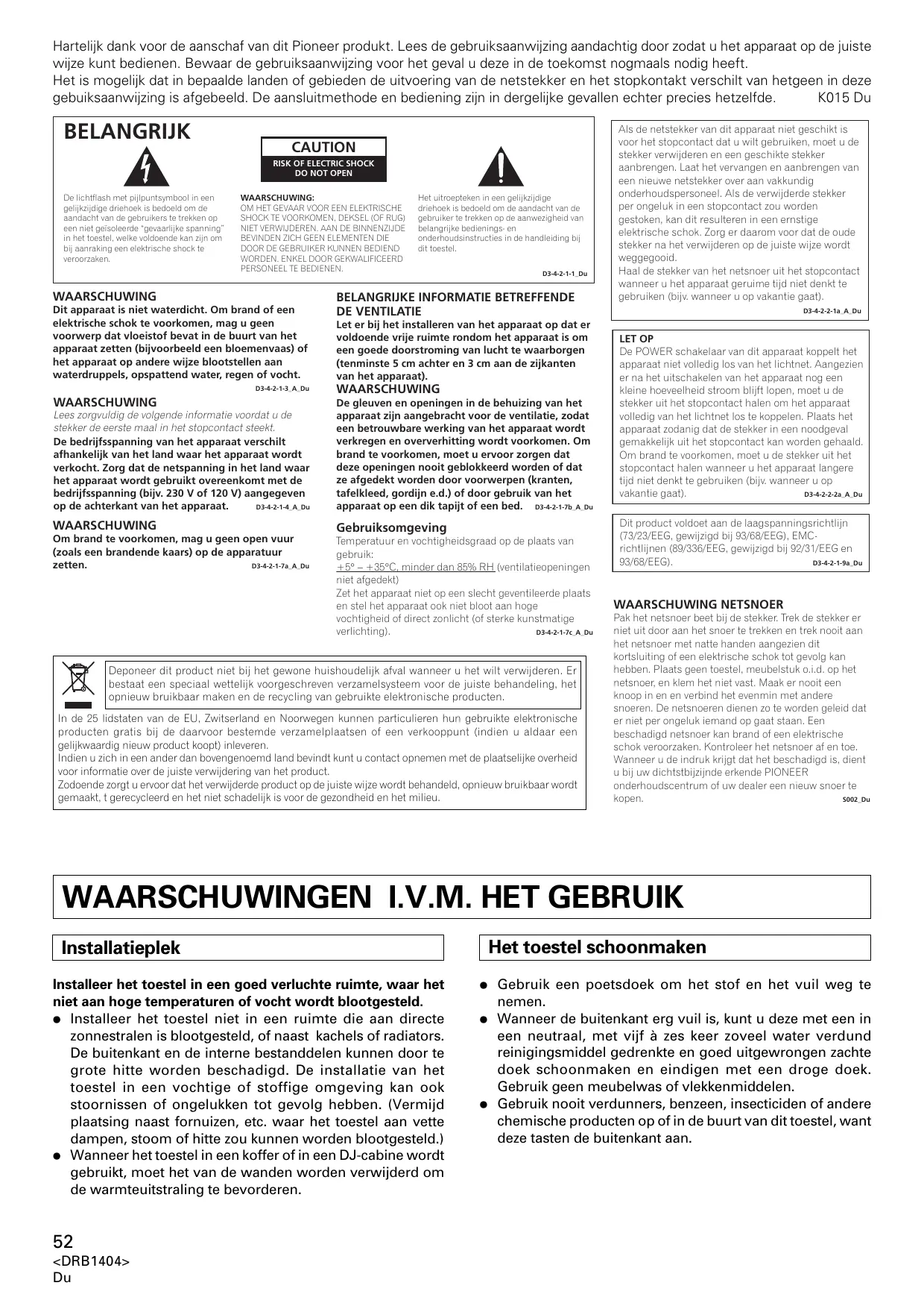 Pak het netsnoer beet bij de stekker. Trek de stekker er Niet uit door aan het snoer te trekken en trek nooit aan het netsnoer met natte handen aangezieten dit kortsluiting of een elektrische schok toget gevolkan hebben. Plaats geen toestel, meubelstuk o.i.d. op het netsnoer, en klem het Niet vast. Maak er nooit een knoop in en en verbind het evenmin met andere snoeren. De netsnoeren dienen zo te worden geleid dat er niert per ongeluk iemand op gaat staan. Een beschadigd netsnoer kan brande en een elektrische schok voorzaken. Kontroleer het netsnoer af en toe. Wanneer u de indruk krijt dat het beschadigd is, dient u bij uw dichtstbijzijnde erkende PIONEER onderhoudscentrum of uw dealer een niewu snoer te kopen. 5002.D