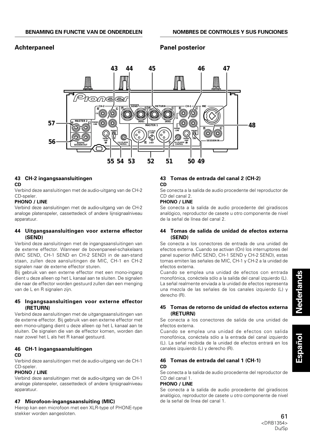 Se conecta a la salida de audio procedente del reproductor de CD del canal 2. PHONO / LINE Se conecta a la salida de audio procedente del giradiscos analógico, reproductor de casete u otro componente de nivel de la señal de línea del canal 2. 44 Uitgangsaansluitingen voor externe effector (SEND) 44 Tomas de salida de unidad de efectos externa (SEND) Verbind deze aansluitingen met de ingangsaansluitingen van de externe effector. Wanneer de bovenpaneel-schakelaars (MIC SEND, CH-1 SEND en CH-2 SEND) in de aan-stand staan, zullen deze aansluitingen de MIC, CH-1 en CH-2 signalen naar de externe effector sturen. Bij gebruik van een externe effector met een mono-ingang dient u deze alleen op het L kanaal aan te sluiten. De signalen die naar de effector worden gestuurd zullen dan een menging van de L en R signalen zijn. Se conecta a los conectores de entrada de una unidad de efectos externa. Cuando se activan (On) los interruptores del panel superior (MIC SEND, CH-1 SEND y CH-2 SEND), estas tomas emiten las señales de MIC, CH-1 y CH-2 a la unidad de efectos externa. Cuando se emplea una unidad de efectos con entrada monofónica, conéctela sólo a la salida del canal izquierdo (L). La señal realmente enviada a la unidad de efectos representa una mezcla de las señales de los canales izquierdo (L) y derecho (R). 45 Ingangsaansluitingen voor externe effector (RETURN) Verbind deze aansluitingen met de uitgangsaansluitingen van de externe effector. Bij gebruik van een externe effector met een mono-uitgang dient u deze alleen op het L kanaal aan te sluiten. De signalen die van de effector komen, worden dan naar zowel het L als het R kanaal gestuurd. 46 CH-1 ingangsaansluitingen Verbind deze aansluitingen met de audio-uitgang van de CH-1 CD-speler. PHONO / LINE Verbind deze aansluitingen met de audio-uitgang van de CH-1 analoge platenspeler, cassettedeck of andere lijnsignaalniveau apparatuur. 47 Microfoon-ingangsaansluiting (MIC) Hierop kan een microfoon met een XLR-type of PHONE-type stekker worden aangesloten. 45 Tomas de retorno de unidad de efectos externa (RETURN) Se conecta a los conectores de salida de una unidad de efectos externa. Cuando se emplea una unidad de efectos con salida monofónica, conéctela sólo a la entrada del canal izquierdo (L). La señal recibida de la unidad de efectos entrará en los canales izquierdo (L) y derecho (R). 46 Tomas de entrada del canal 1 (CH-1) Se conecta a la salida de audio procedente del reproductor de CD del canal 1. PHONO / LINE Se conecta a la salida de audio procedente del giradiscos analógico, reproductor de casete u otro componente de nivel de la señal de línea del canal 1.