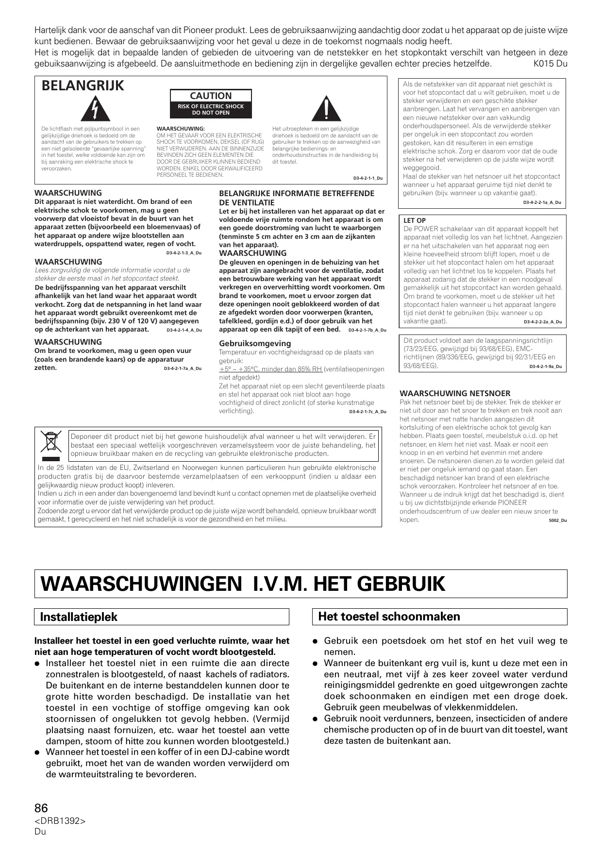 Pak het netsnoer beet bij de stekker. Trek de stekker er Niet uit door aan het snoer te trekken en trek nooit aan het netsnoer met natte handen aangezieten kortsluiting of een elektrische schok toget gevolkan hebben. Plaats geen toestel, meubelstuk o.i.d. op het netsnoer, en klem het Niet vast. Maak er nooit een knoop in en en verbind het evenmin met andere snoeren. De netsnoeren dienen zo te worden geleid dat er niert per ongeluk iemand op gaat staan. Eien beschadigd netsnoer kan brande en een elektrische schok voorzaken. Kontroleer het netsnoer af en toe. Wanneer u de indruk krijt dat het beschadigd is, dient u bij uw dichtstbijzijnde erkende PIONEER onderhoudscentrum of uw dealer een niewu snoer te kopen. 5002.D