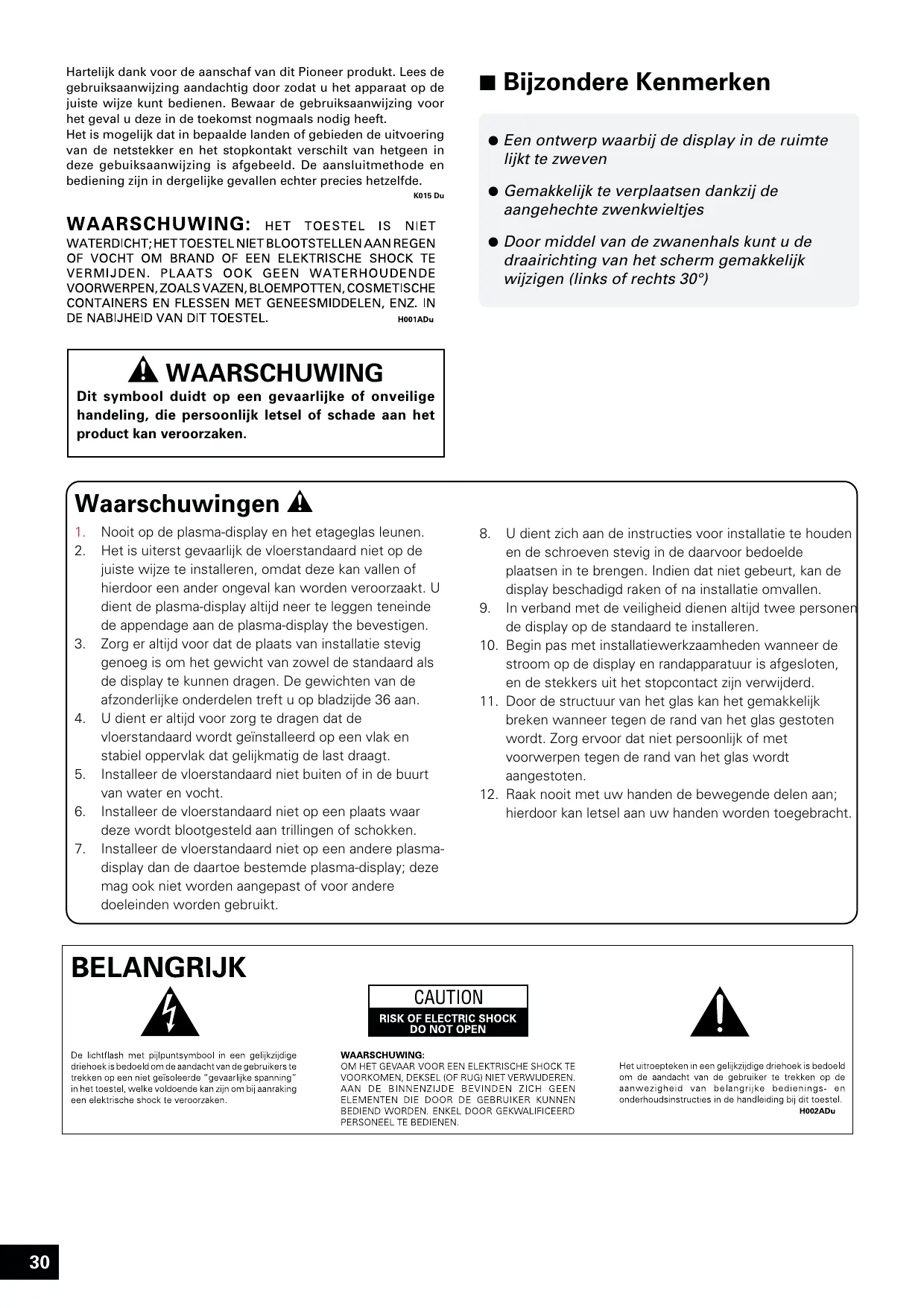 Nooit op de plasma-display en het etageglas leunen. Het is uiterst gevaarlijk de vloerstandaard niet op de juiste wijze te installeren, omdat deze kan vallen of hierdoor een ander ongeval kan worden veroorzaakt. U dient de plasma-display altijd neer te leggen teneinde de appendage aan de plasma-display the bevestigen. Zorg er altijd voor dat de plaats van installatie stevig genoeg is om het gewicht van zowel de standaard als de display te kunnen dragen. De gewichten van de afzonderlijke onderdelen treft u op bladzijde 36 aan. U dient er altijd voor zorg te dragen dat de vloerstandaard wordt geïnstalleerd op een vlak en stabiel oppervlak dat gelijkmatig de last draagt. Installeer de vloerstandaard niet buiten of in de buurt van water en vocht. Installeer de vloerstandaard niet op een plaats waar deze wordt blootgesteld aan trillingen of schokken. Installeer de vloerstandaard niet op een andere plasmadisplay dan de daartoe bestemde plasma-display; deze mag ook niet worden aangepast of voor andere doeleinden worden gebruikt.