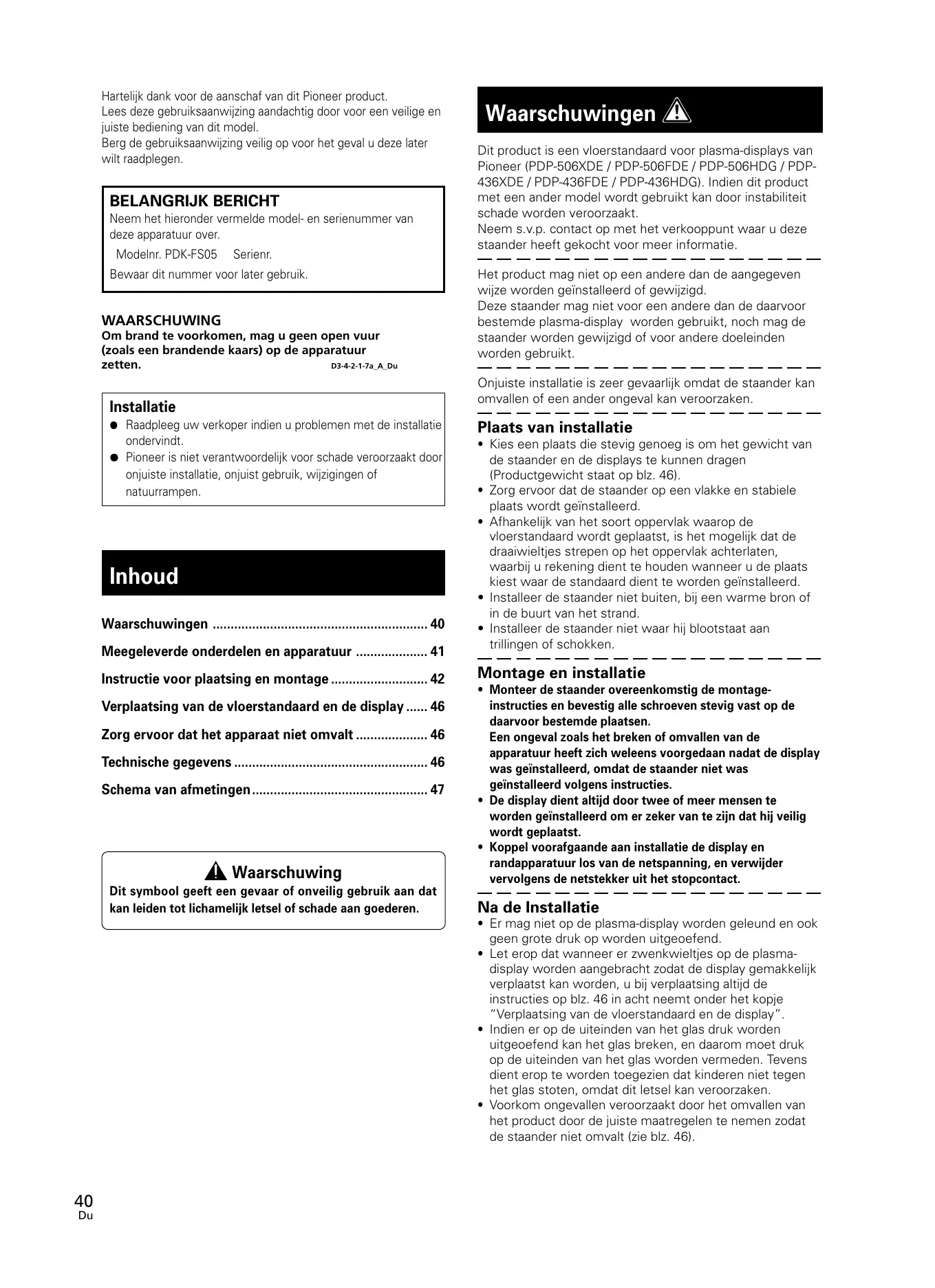- Hartelijk dank voor de aanschaf van dit Pioneer product. Lees deze gebruiksaanwijzing aandachtig door voor een veilige en juiste bediening van dit model. Berg de gebruiksaanwijzing veilig op voor het geval u deze later wilt raadplegen. BELANGRIJK BERICHT Neem het hieronder vermelde model- en serienummer van deze apparatuur over. Modelnr. PDK-FS05 Serienr. Bewaar dit nummer voor later gebruik. WAARSCHUWING Om brand te voorkomen, mag u geen open vuur (zoals een brandende kaars) op de apparatuur D3-4-2-1-7a_A_Du zetten. Waarschuwingen Dit product is een vloerstandaard voor plasma-displays van Pioneer (PDP-506XDE / PDP-506FDE / PDP-506HDG / PDP436XDE / PDP-436FDE / PDP-436HDG). Indien dit product met een ander model wordt gebruikt kan door instabiliteit schade worden veroorzaakt. Neem s.v.p. contact op met het verkooppunt waar u deze staander heeft gekocht voor meer informatie. Het product mag niet op een andere dan de aangegeven wijze worden geïnstalleerd of gewijzigd. Deze staander mag niet voor een andere dan de daarvoor bestemde plasma-display worden gebruikt, noch mag de staander worden gewijzigd of voor andere doeleinden worden gebruikt. Onjuiste installatie is zeer gevaarlijk omdat de staander kan omvallen of een ander ongeval kan veroorzaken. Installatie ¶ Raadpleeg uw verkoper indien u problemen met de installatie ondervindt. ¶ Pioneer is niet verantwoordelijk voor schade veroorzaakt door onjuiste installatie, onjuist gebruik, wijzigingen of natuurrampen. Inhoud Waarschuwingen p. 40