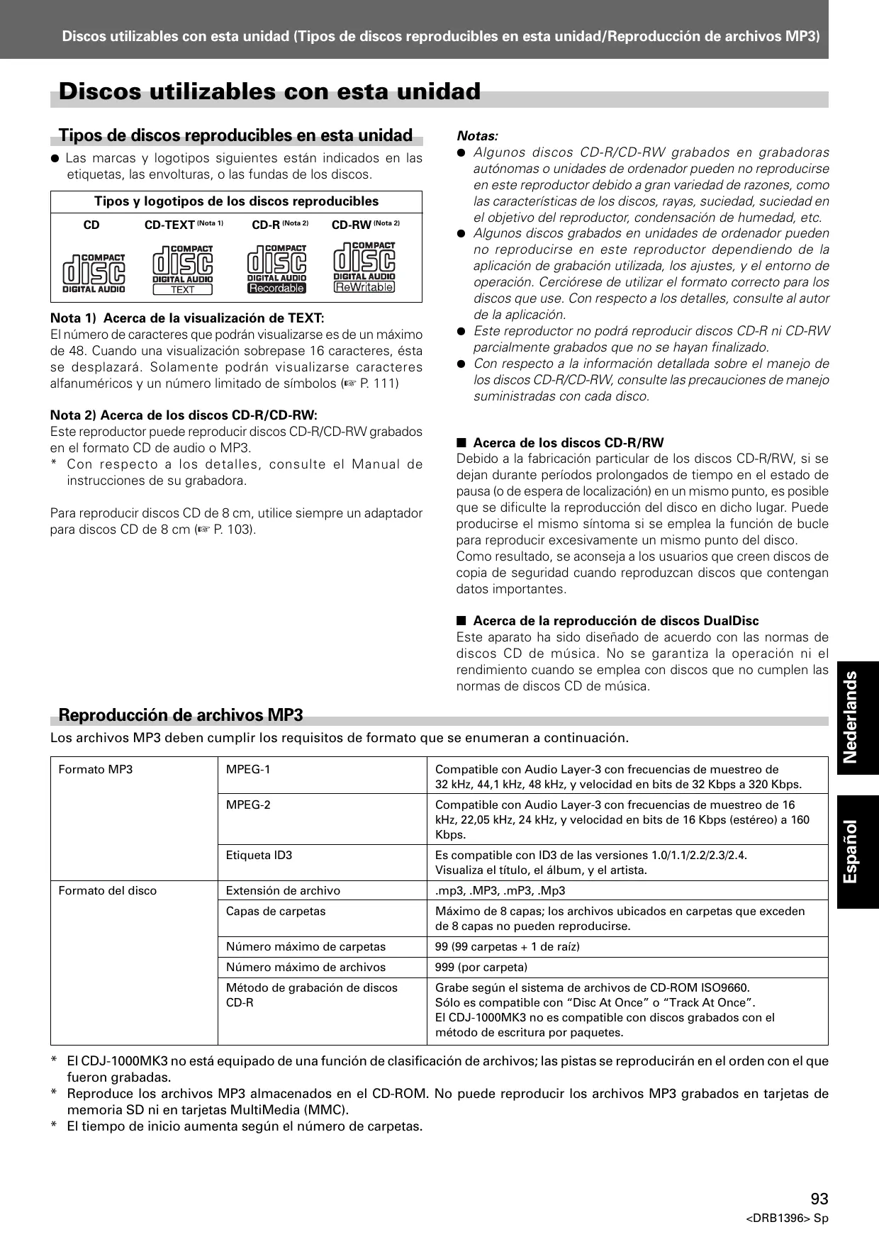 Deze speler is geschikt voor het afspelen van CD-R en CD-RW discs {opgenomen in muziek-CD of MP3 formaat). (Het is mogelik dat sommige discs niet juist worden afgespeeld als gevolg van de eigenschappen van de afzonderlike discs en recorders, of eventueel vuil of krassen op de discs.) MP3.DJ-WEERGAVE MP3-bestanden die zin opgenomen op een CD-ROM kunnen worden afgespeeld met DJuncties