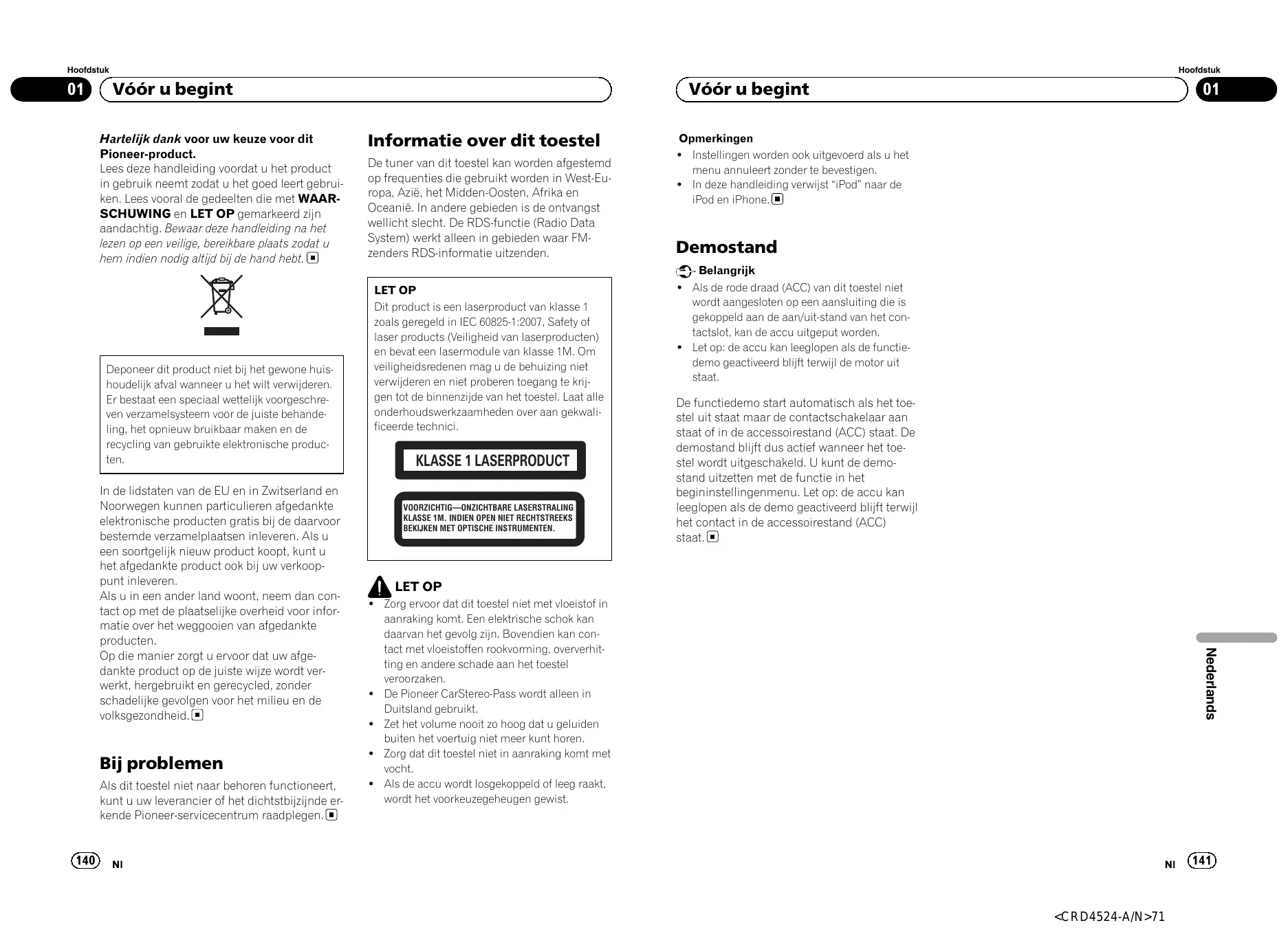 BEKIJKEN MET OPTISCHE INSTRUMENTEN. De functiedemo start automatisch als het toestel uit staat maar de contactschakelaar aan staat of in de accessoirestand (ACC) staat. De demostand blijft dus actief wanneer het toestel wordt uitgeschakeld. U kunt de demostand uitzetten met de functie in het begininstellingenmenu. Let op: de accu kan leeglopen als de demo geactiveerd blijft terwijl het contact in de accessoirestand (ACC) staat. LET OP ! Zorg ervoor dat dit toestel niet met vloeistof in aanraking komt. Een elektrische schok kan daarvan het gevolg zijn. Bovendien kan contact met vloeistoffen rookvorming, oververhitting en andere schade aan het toestel veroorzaken. ! De Pioneer CarStereo-Pass wordt alleen in Duitsland gebruikt. ! Zet het volume nooit zo hoog dat u geluiden buiten het voertuig niet meer kunt horen. ! Zorg dat dit toestel niet in aanraking komt met vocht. ! Als de accu wordt losgekoppeld of leeg raakt, wordt het voorkeuzegeheugen gewist. Nederlands In de lidstaten van de EU en in Zwitserland en Noorwegen kunnen particulieren afgedankte elektronische producten gratis bij de daarvoor bestemde verzamelplaatsen inleveren. Als u een soortgelijk nieuw product koopt, kunt u het afgedankte product ook bij uw verkooppunt inleveren. Als u in een ander land woont, neem dan contact op met de plaatselijke overheid voor informatie over het weggooien van afgedankte producten. Op die manier zorgt u ervoor dat uw afgedankte product op de juiste wijze wordt verwerkt, hergebruikt en gerecycled, zonder schadelijke gevolgen voor het milieu en de volksgezondheid. LET OP Dit product is een laserproduct van klasse 1 zoals geregeld in IEC 60825-1:2007, Safety of laser products (Veiligheid van laserproducten) en bevat een lasermodule van klasse 1M. Om veiligheidsredenen mag u de behuizing niet verwijderen en niet proberen toegang te krijgen tot de binnenzijde van het toestel. Laat alle onderhoudswerkzaamheden over aan gekwalificeerde technici. ! Als de rode draad (ACC) van dit toestel niet wordt aangesloten op een aansluiting die is gekoppeld aan de aan/uit-stand van het contactslot, kan de accu uitgeput worden. ! Let op: de accu kan leeglopen als de functiedemo geactiveerd blijft terwijl de motor uit staat.