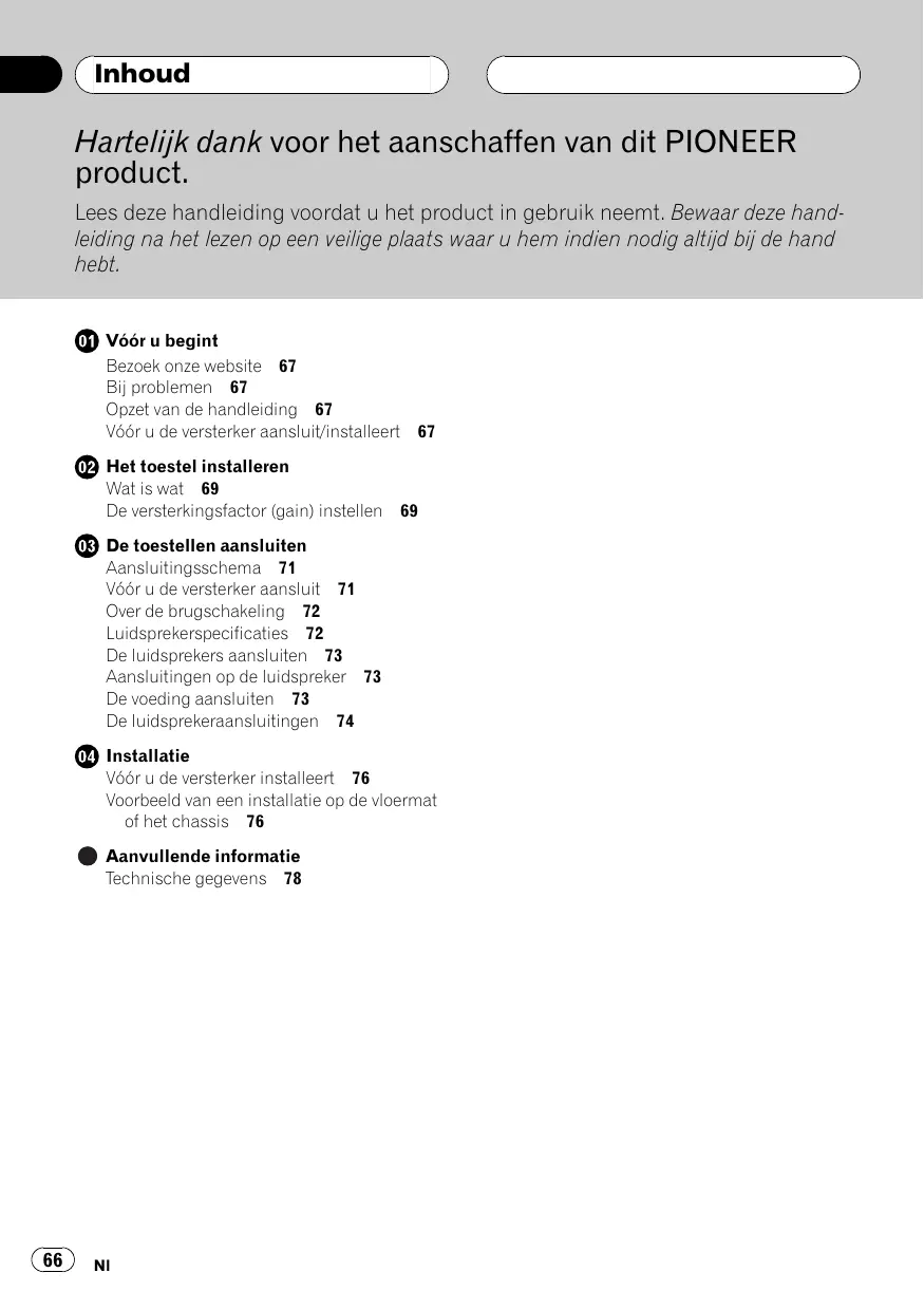 Inhoud Hartelijk dank voor het aanschaffen van dit PIONEER product. Lees deze handleiding voordat u het product in gebruik neemt. Bewaar deze handleiding na het lezen op een veilige plaats waar u hem indien nodig altijd bij de hand hebt. Vóór u begint Bezoek onze website 67 Bij problemen 67 Opzet van de handleiding 67 Vóór u de versterker aansluit/installeert 67 Het toestel installeren Wat is wat 69 De versterkingsfactor (gain) instellen 69 De toestellen aansluiten Aansluitingsschema 71 Vóór u de versterker aansluit 71 Over de brugschakeling 72 Luidsprekerspecificaties 72 De luidsprekers aansluiten 73 Aansluitingen op de luidspreker 73 De voeding aansluiten 73 De luidsprekeraansluitingen 74 Installatie Vóór u de versterker installeert 76 Voorbeeld van een installatie op de vloermat of het chassis 76 Aanvullende informatie Technische gegevens 78