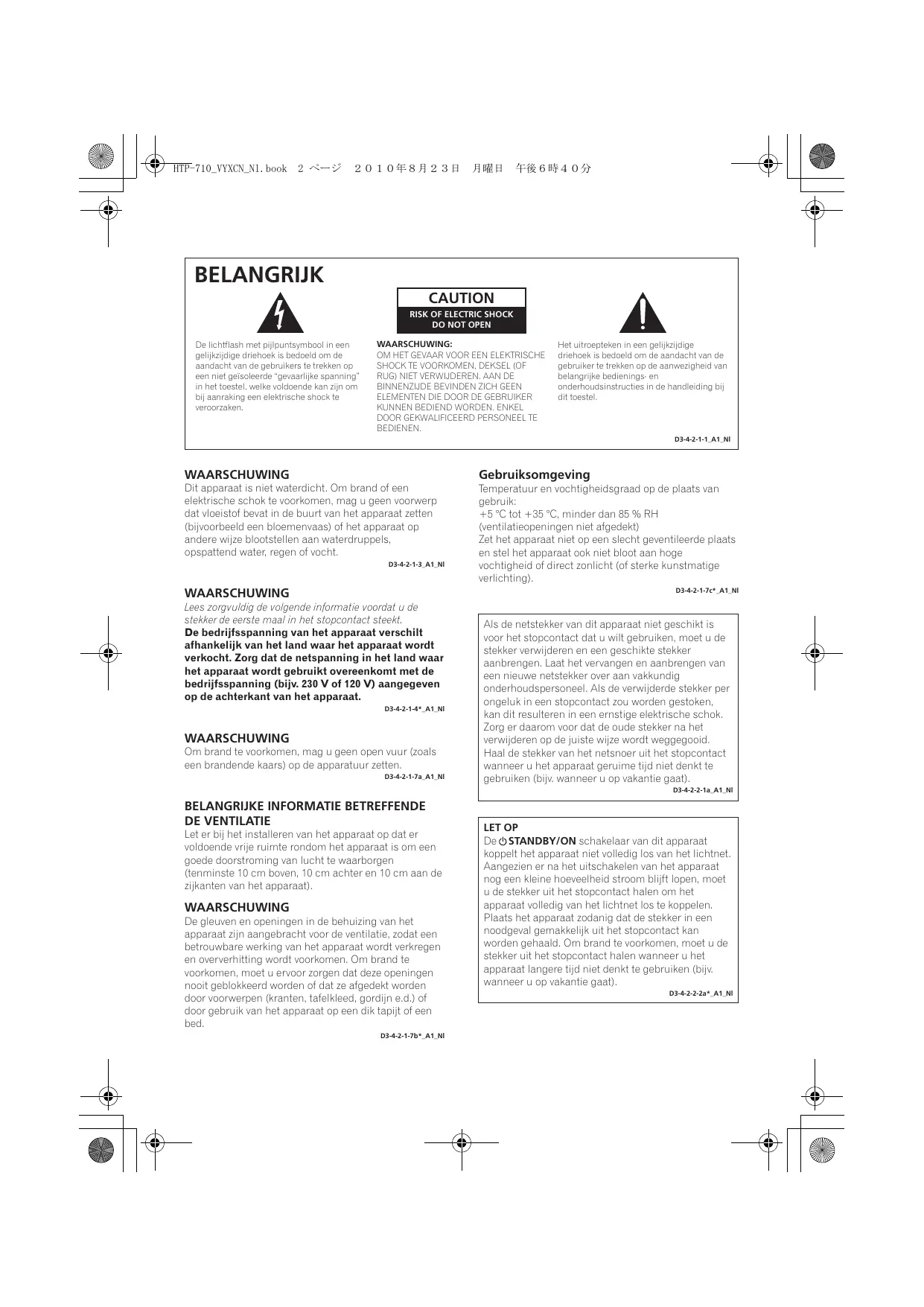WAARSCHUWING De gleuven en openingen in de behuizing van het apparaat zijn aangebracht voor de ventilatie, zodat een betrouwbare werking van het apparaat wordt verkregen en oververhitting wordt voorkomen. Om brand te voorkomen, moet u ervoor zorgen dat deze openingen nooit geblokkeerd worden of dat ze afgedekt worden door voorwerpen (kranten, tafelkleed, gordijn e.d.) of door gebruik van het apparaat op een dik tapijt of een bed. D3-4-2-1-7b*_A1_Nl