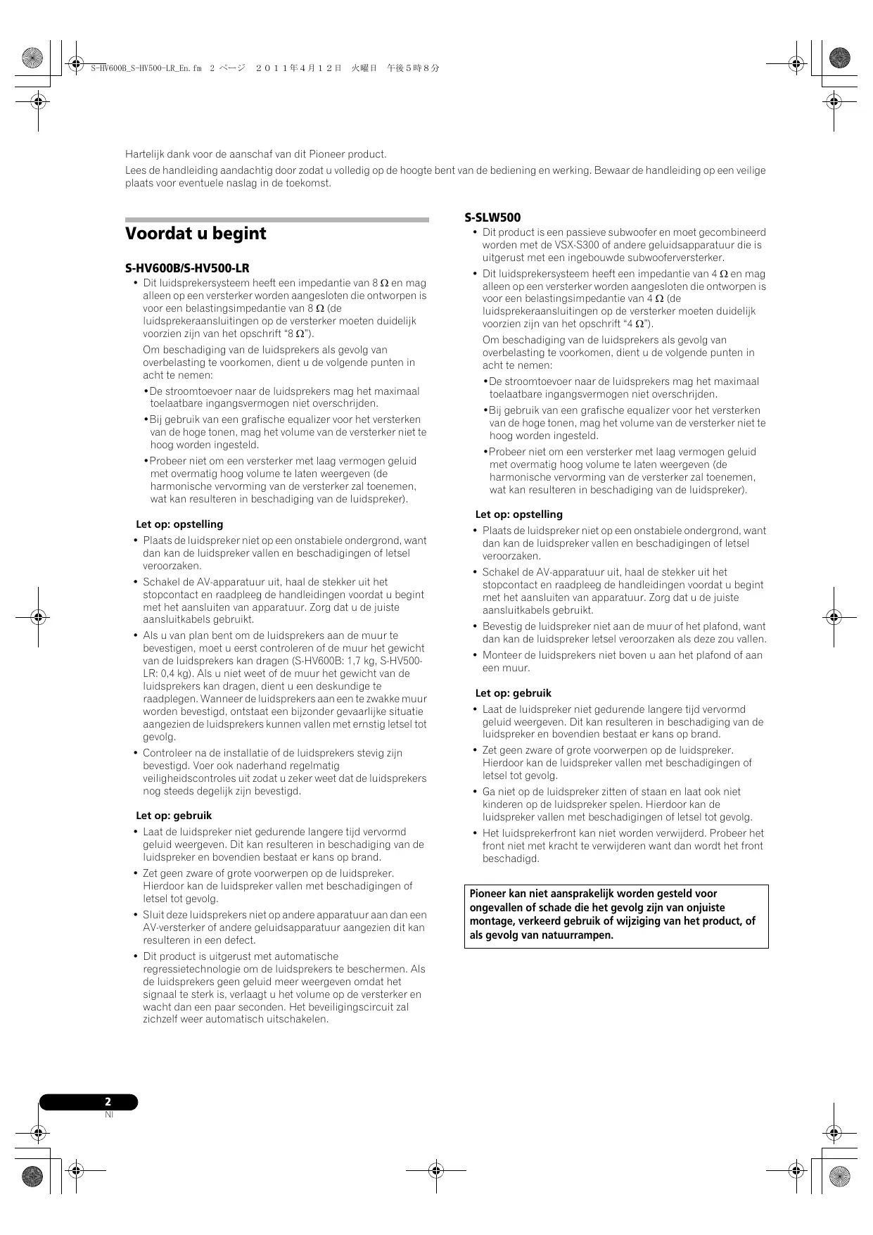 • Dit luidsprekersysteem heeft een impedantie van 8 Ω en mag alleen op een versterker worden aangesloten die ontworpen is voor een belastingsimpedantie van 8 Ω (de luidsprekeraansluitingen op de versterker moeten duidelijk voorzien zijn van het opschrift “8 Ω”). Om beschadiging van de luidsprekers als gevolg van overbelasting te voorkomen, dient u de volgende punten in acht te nemen: •De stroomtoevoer naar de luidsprekers mag het maximaal toelaatbare ingangsvermogen niet overschrijden. •Bij gebruik van een grafische equalizer voor het versterken van de hoge tonen, mag het volume van de versterker niet te hoog worden ingesteld. •Probeer niet om een versterker met laag vermogen geluid met overmatig hoog volume te laten weergeven (de harmonische vervorming van de versterker zal toenemen, wat kan resulteren in beschadiging van de luidspreker). Let op: opstelling • Plaats de luidspreker niet op een onstabiele ondergrond, want dan kan de luidspreker vallen en beschadigingen of letsel veroorzaken. • Schakel de AV-apparatuur uit, haal de stekker uit het stopcontact en raadpleeg de handleidingen voordat u begint met het aansluiten van apparatuur. Zorg dat u de juiste aansluitkabels gebruikt. • Als u van plan bent om de luidsprekers aan de muur te bevestigen, moet u eerst controleren of de muur het gewicht van de luidsprekers kan dragen (S-HV600B: 1,7 kg, S-HV500LR: 0,4 kg). Als u niet weet of de muur het gewicht van de luidsprekers kan dragen, dient u een deskundige te raadplegen. Wanneer de luidsprekers aan een te zwakke muur worden bevestigd, ontstaat een bijzonder gevaarlijke situatie aangezien de luidsprekers kunnen vallen met ernstig letsel tot gevolg. • Controleer na de installatie of de luidsprekers stevig zijn bevestigd. Voer ook naderhand regelmatig veiligheidscontroles uit zodat u zeker weet dat de luidsprekers nog steeds degelijk zijn bevestigd. Let op: gebruik • Laat de luidspreker niet gedurende langere tijd vervormd geluid weergeven. Dit kan resulteren in beschadiging van de luidspreker en bovendien bestaat er kans op brand. • Zet geen zware of grote voorwerpen op de luidspreker. Hierdoor kan de luidspreker vallen met beschadigingen of letsel tot gevolg. • Sluit deze luidsprekers niet op andere apparatuur aan dan een AV-versterker of andere geluidsapparatuur aangezien dit kan resulteren in een defect. • Dit product is uitgerust met automatische regressietechnologie om de luidsprekers te beschermen. Als de luidsprekers geen geluid meer weergeven omdat het signaal te sterk is, verlaagt u het volume op de versterker en wacht dan een paar seconden. Het beveiligingscircuit zal zichzelf weer automatisch uitschakelen.