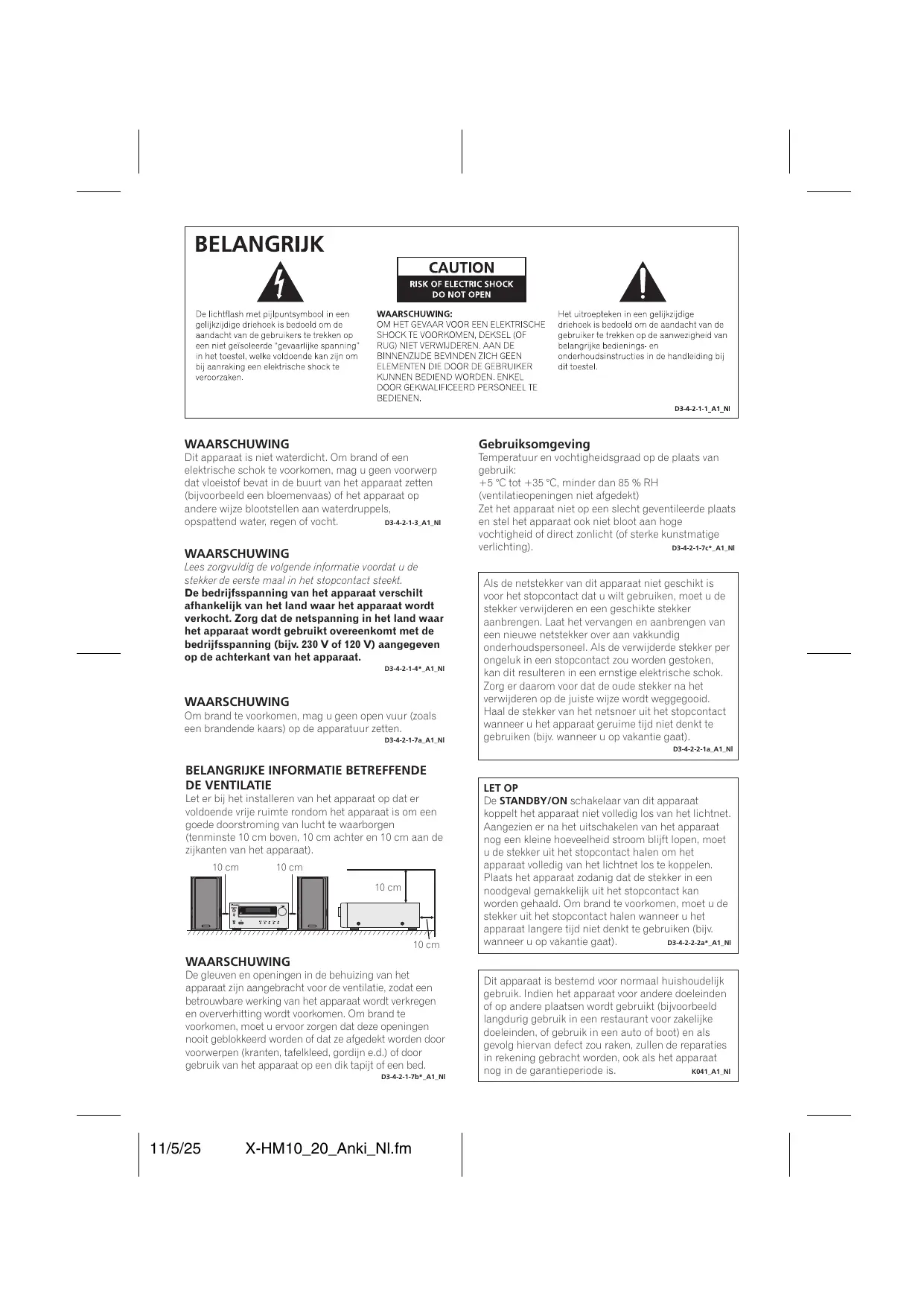 DE VENTILATIE Let er bij het installeren van het apparaat op dat er voldoende vrije ruimte rondom het apparaat is om een goede doorstroming van lucht te waarborgen (tenminste 10 cm boven, 10 cm achter en 10 cm aan de zijkanten van het apparaat). 10 cm 10 cm 10 cm 10 cm LET OP De STANDBY/ON schakelaar van dit apparaat koppelt het apparaat niet volledig los van het lichtnet. Aangezien er na het uitschakelen van het apparaat nog een kleine hoeveelheid stroom blijft lopen, moet u de stekker uit het stopcontact halen om het apparaat volledig van het lichtnet los te koppelen. Plaats het apparaat zodanig dat de stekker in een noodgeval gemakkelijk uit het stopcontact kan worden gehaald. Om brand te voorkomen, moet u de stekker uit het stopcontact halen wanneer u het apparaat langere tijd niet denkt te gebruiken (bijv. D3-4-2-2-2a*_A1_Nl wanneer u op vakantie gaat). WAARSCHUWING De gleuven en openingen in de behuizing van het apparaat zijn aangebracht voor de ventilatie, zodat een betrouwbare werking van het apparaat wordt verkregen en oververhitting wordt voorkomen. Om brand te voorkomen, moet u ervoor zorgen dat deze openingen nooit geblokkeerd worden of dat ze afgedekt worden door voorwerpen (kranten, tafelkleed, gordijn e.d.) of door gebruik van het apparaat op een dik tapijt of een bed. D3-4-2-1-7b*_A1_Nl 11/5/25 X-HM10_20_Anki_Nl.fm Dit apparaat is bestemd voor normaal huishoudelijk gebruik. Indien het apparaat voor andere doeleinden of op andere plaatsen wordt gebruikt (bijvoorbeeld langdurig gebruik in een restaurant voor zakelijke doeleinden, of gebruik in een auto of boot) en als gevolg hiervan defect zou raken, zullen de reparaties in rekening gebracht worden, ook als het apparaat K041_A1_Nl nog in de garantieperiode is. Over condensvocht Als de disc-speler direct van een koude omgeving in een warme kamer wordt geplaatst (’s winters bijvoorbeeld), of als de kamer waarin de disc-speler staat plotseling snel wordt verwarmd, kan er vocht uit de lucht in het inwendige van het apparaat condenseren (als druppeltjes op de lens e.d.). Na dergelijke condensatie zal de disc-speler niet goed werken, zodat u geen discs kunt afspelen. Laat de disc-speler dan 1 tot 2 uur lang (afhankelijk van de hoeveelheid condensatie) ongebruikt aan staan, totdat het condensvocht verdampt is. Wanneer alle condens is verdampt, zal de disc-speler weer normaal werken. Condensatie kan ook ’s zomers optreden, als de disc-speler in de koude luchtstroom van een airconditioning staat. In dat geval kunt u de disc-speler S005_A1_Nl beter ergens anders zetten. D-3 11/5/25 X-HM10_20_Anki_Nl.fm