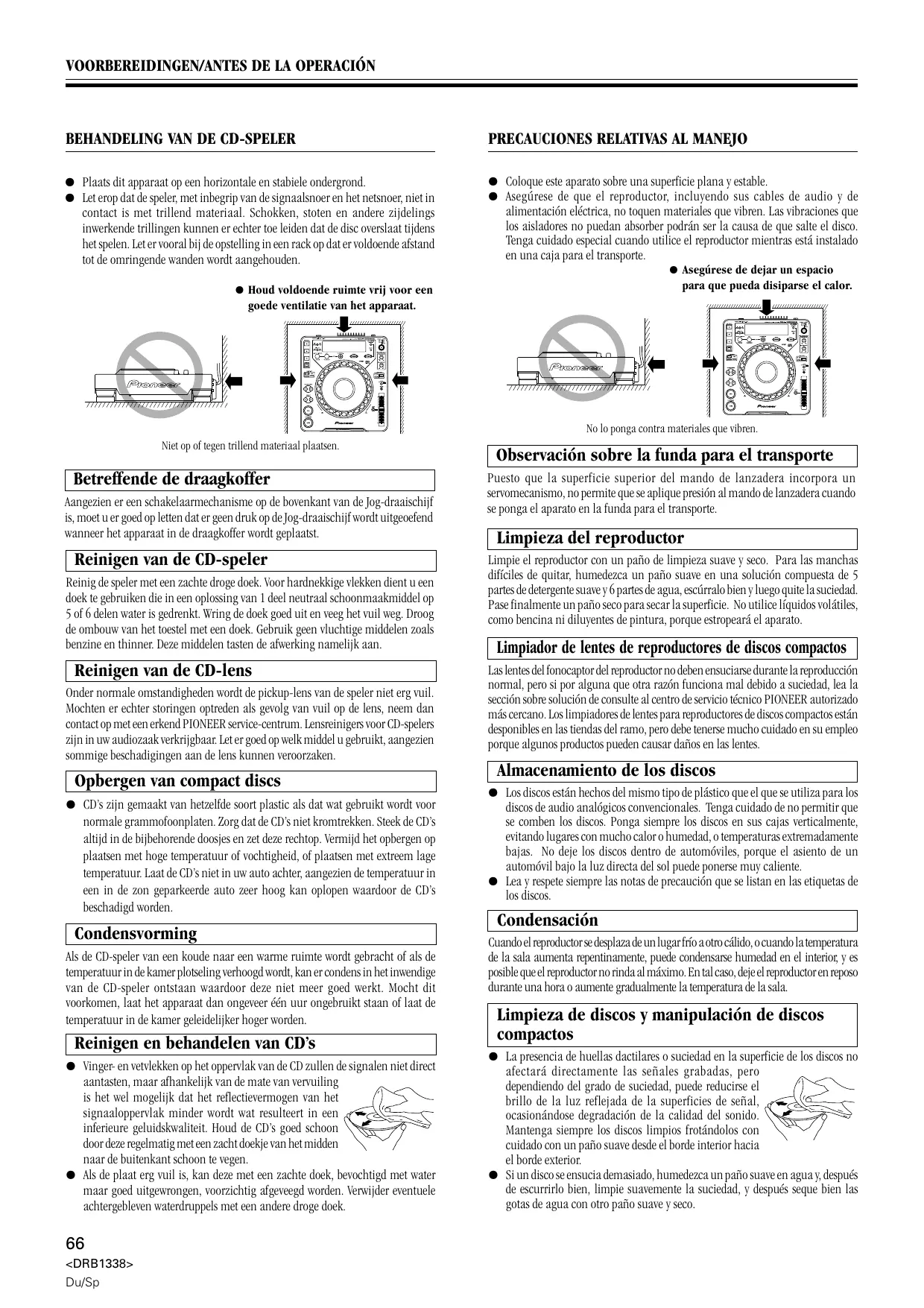 ¶ Plaats dit apparaat op een horizontale en stabiele ondergrond. ¶ Let erop dat de speler, met inbegrip van de signaalsnoer en het netsnoer, niet in contact is met trillend materiaal. Schokken, stoten en andere zijdelings inwerkende trillingen kunnen er echter toe leiden dat de disc overslaat tijdens het spelen. Let er vooral bij de opstelling in een rack op dat er voldoende afstand tot de omringende wanden wordt aangehouden. ¶ Coloque este aparato sobre una superficie plana y estable. ¶ Asegúrese de que el reproductor, incluyendo sus cables de audio y de alimentación eléctrica, no toquen materiales que vibren. Las vibraciones que los aisladores no puedan absorber podrán ser la causa de que salte el disco. Tenga cuidado especial cuando utilice el reproductor mientras está instalado en una caja para el transporte. ¶ Asegúrese de dejar un espacio para que pueda disiparse el calor. ¶ Houd voldoende ruimte vrij voor een goede ventilatie van het apparaat. No lo ponga contra materiales que vibren. Niet op of tegen trillend materiaal plaatsen. Betreffende de draagkoffer Aangezien er een schakelaarmechanisme op de bovenkant van de Jog-draaischijf is, moet u er goed op letten dat er geen druk op de Jog-draaischijf wordt uitgeoefend wanneer het apparaat in de draagkoffer wordt geplaatst. Reinigen van de CD-speler Reinig de speler met een zachte droge doek. Voor hardnekkige vlekken dient u een doek te gebruiken die in een oplossing van 1 deel neutraal schoonmaakmiddel op 5 of 6 delen water is gedrenkt. Wring de doek goed uit en veeg het vuil weg. Droog de ombouw van het toestel met een doek. Gebruik geen vluchtige middelen zoals benzine en thinner. Deze middelen tasten de afwerking namelijk aan. Reinigen van de CD-lens Onder normale omstandigheden wordt de pickup-lens van de speler niet erg vuil. Mochten er echter storingen optreden als gevolg van vuil op de lens, neem dan contact op met een erkend PIONEER service-centrum. Lensreinigers voor CD-spelers zijn in uw audiozaak verkrijgbaar. Let er goed op welk middel u gebruikt, aangezien sommige beschadigingen aan de lens kunnen veroorzaken. Opbergen van compact discs ¶ CD’s zijn gemaakt van hetzelfde soort plastic als dat wat gebruikt wordt voor normale grammofoonplaten. Zorg dat de CD’s niet kromtrekken. Steek de CD’s altijd in de bijbehorende doosjes en zet deze rechtop. Vermijd het opbergen op plaatsen met hoge temperatuur of vochtigheid, of plaatsen met extreem lage temperatuur. Laat de CD’s niet in uw auto achter, aangezien de temperatuur in een in de zon geparkeerde auto zeer hoog kan oplopen waardoor de CD’s beschadigd worden. Condensvorming Als de CD-speler van een koude naar een warme ruimte wordt gebracht of als de temperatuur in de kamer plotseling verhoogd wordt, kan er condens in het inwendige van de CD-speler ontstaan waardoor deze niet meer goed werkt. Mocht dit voorkomen, laat het apparaat dan ongeveer één uur ongebruikt staan of laat de temperatuur in de kamer geleidelijker hoger worden. Reinigen en behandelen van CD’s ¶ Vinger- en vetvlekken op het oppervlak van de CD zullen de signalen niet direct aantasten, maar afhankelijk van de mate van vervuiling is het wel mogelijk dat het reflectievermogen van het signaaloppervlak minder wordt wat resulteert in een inferieure geluidskwaliteit. Houd de CD’s goed schoon door deze regelmatig met een zacht doekje van het midden naar de buitenkant schoon te vegen. ¶ Als de plaat erg vuil is, kan deze met een zachte doek, bevochtigd met water maar goed uitgewrongen, voorzichtig afgeveegd worden. Verwijder eventuele achtergebleven waterdruppels met een andere droge doek.