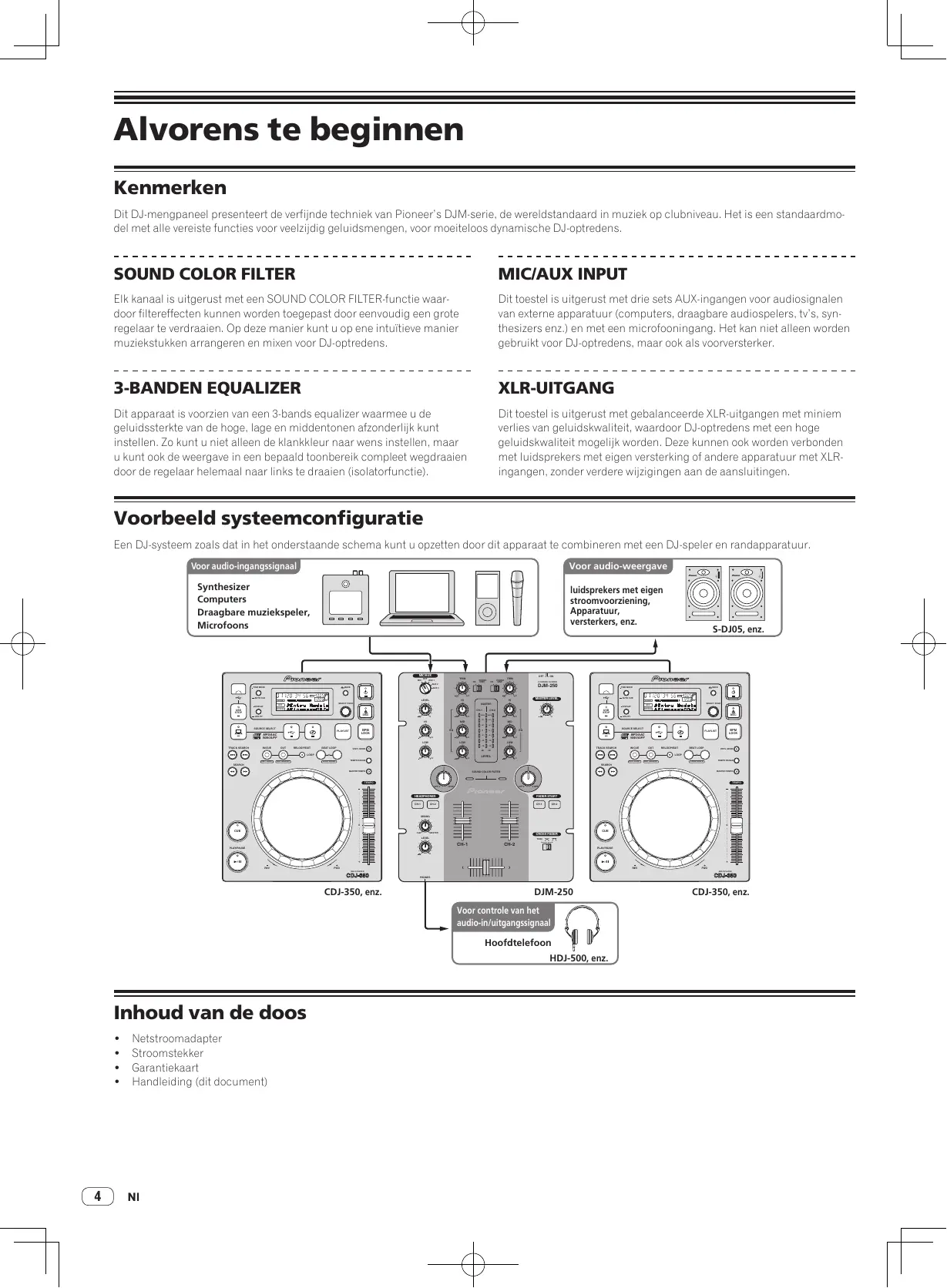Elk kanaal is uitgerust met een SOUND COLOR FILTER-functie waardoor filtereffecten kunnen worden toegepast door eenvoudig een grote regelaar te verdraaien. Op deze manier kunt u op ene intuïtieve manier muziekstukken arrangeren en mixen voor DJ-optredens. Dit toestel is uitgerust met drie sets AUX-ingangen voor audiosignalen van externe apparatuur (computers, draagbare audiospelers, tv’s, synthesizers enz.) en met een microfooningang. Het kan niet alleen worden gebruikt voor DJ-optredens, maar ook als voorversterker. 3-BANDEN EQUALIZER XLR-UITGANG Dit apparaat is voorzien van een 3-bands equalizer waarmee u de geluidssterkte van de hoge, lage en middentonen afzonderlijk kunt instellen. Zo kunt u niet alleen de klankkleur naar wens instellen, maar u kunt ook de weergave in een bepaald toonbereik compleet wegdraaien door de regelaar helemaal naar links te draaien (isolatorfunctie). Dit toestel is uitgerust met gebalanceerde XLR-uitgangen met miniem verlies van geluidskwaliteit, waardoor DJ-optredens met een hoge geluidskwaliteit mogelijk worden. Deze kunnen ook worden verbonden met luidsprekers met eigen versterking of andere apparatuur met XLRingangen, zonder verdere wijzigingen aan de aansluitingen. Voorbeeld systeemconfiguratie Een DJ-systeem zoals dat in het onderstaande schema kunt u opzetten door dit apparaat te combineren met een DJ-speler en randapparatuur. Voor audio-ingangssignaal Voor audio-weergave INPUT INPUT