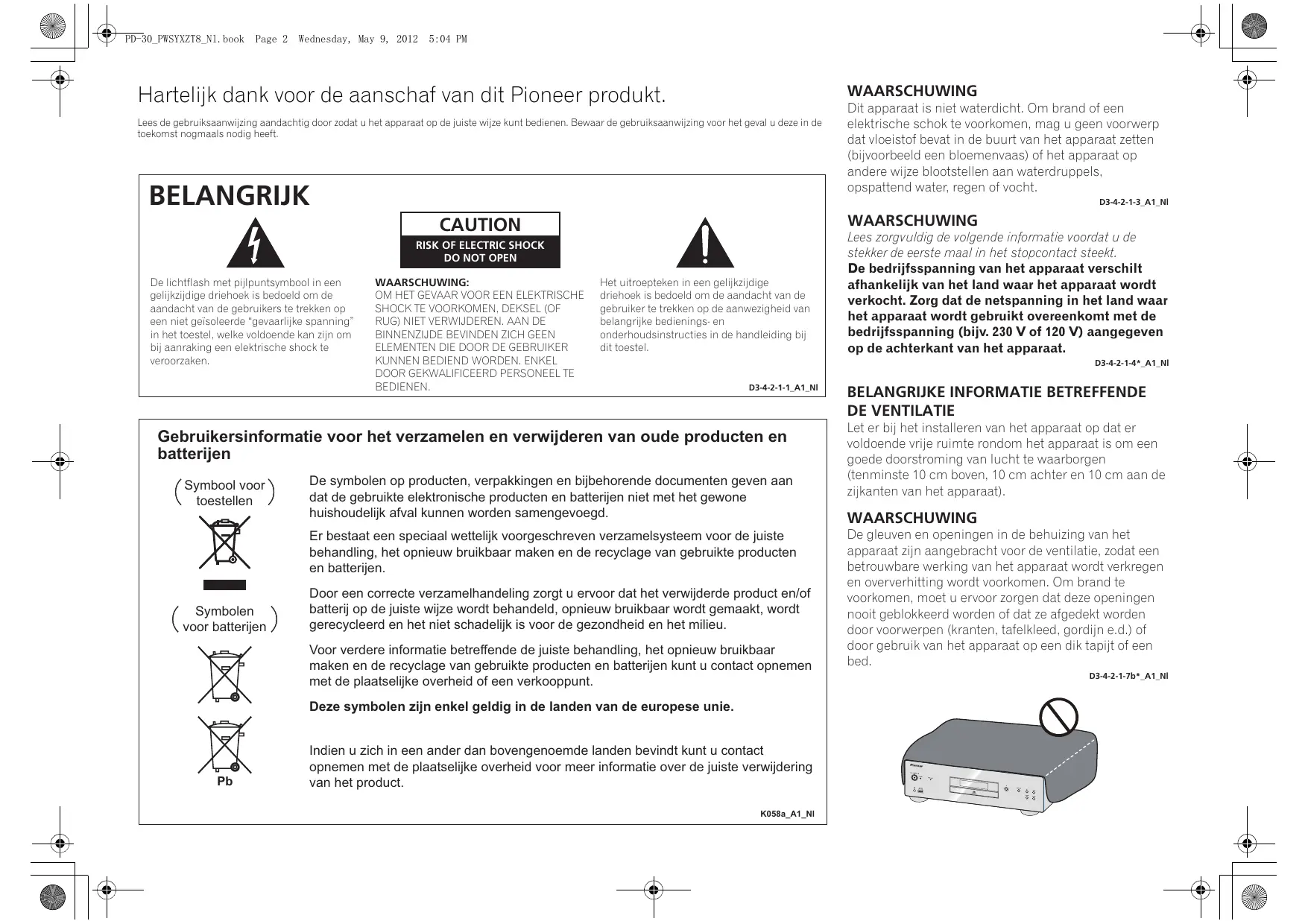 l 7 PD-30 PHSYXZTS NI. book Page 2 Wednesday, May 9, 2012 5:04 PM Hartelijk dank voor de aanschaf van dit Pioneer produkt. Lees de gebruiksaanwijzing aandachtig door zodat u het apparaat op de juiste wijze kunt bedienen. Bewaar de gebruiksaanwijzing voor het geval u deze in de BELANGRIUK